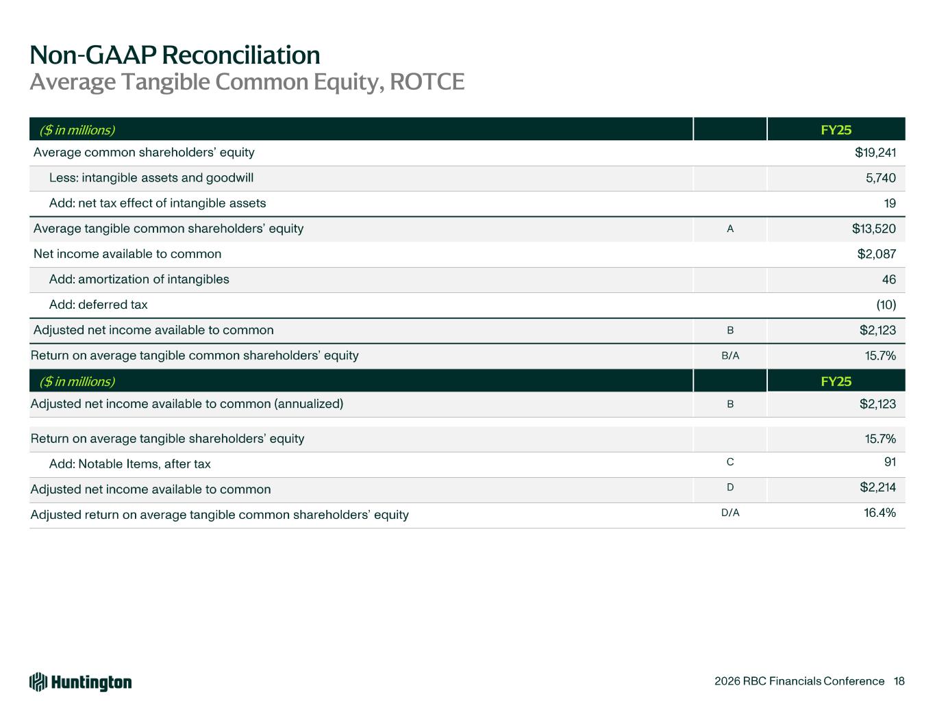 Abundant Green R: 126 G: 207 B: 28 Dark Teal R: 3 G: 79 B: 84 Pastel Teal R: 184 G: 239 B: 228 Pastel Magenta R: 248 G: 224 B: 229 White R: 255 G: 255 B: 255 Prosperous Sage R: 0 G: 45 B: 42 Primary Palette Off-White R: 245 G: 245 B: 245 Highlight Green R: 177 G: 238 B: 44 Legacy Green R: 45 G: 130 B: 42 Light Teal R: 121 G: 222 B: 226 Deep Sage R: 33 G: 72 B: 70 Highlight Teal R: 58 G: 204 B: 223 Charts/Graphs Palette Pastel Magenta R: 248 G: 224 B: 229 Dark Magenta R: 80 G: 16 B: 89 Highlight Magenta R: 193 G: 22 B: 216 Capstone Blue R: 4 G: 30 B: 66 Deep Magenta R: 144 G: 5 B: 163 Second Palette 2026 RBC Financials Conference 18 Non-GAAP Reconciliation Average Tangible Common Equity, ROTCE ($ in millions) FY25 Average common shareholders’ equity $19,241 Less: intangible assets and goodwill 5,740 Add: net tax effect of intangible assets 19 Average tangible common shareholders’ equity A $13,520 Net income available to common $2,087 Add: amortization of intangibles 46 Add: deferred tax (10) Adjusted net income available to common B $2,123 Return on average tangible common shareholders’ equity B/A 15.7% ($ in millions) FY25 Adjusted net income available to common (annualized) B $2,123 Return on average tangible shareholders’ equity 15.7% Add: Notable Items, after tax C 91 Adjusted net income available to common D $2,214 Adjusted return on average tangible common shareholders’ equity D/A 16.4%