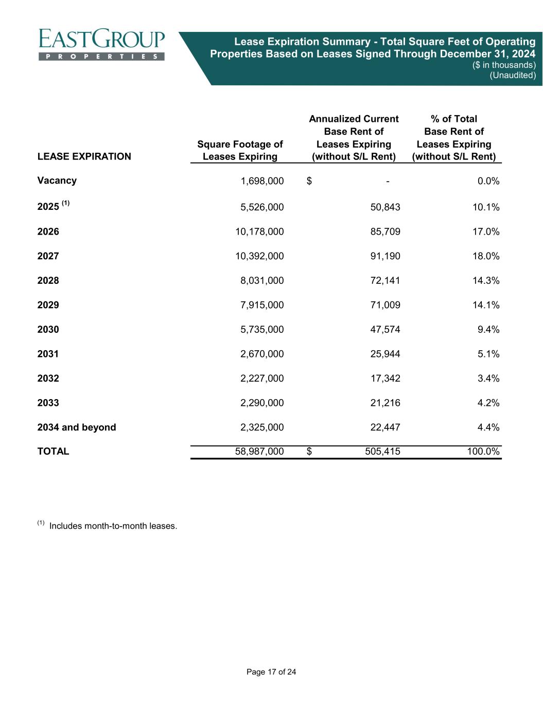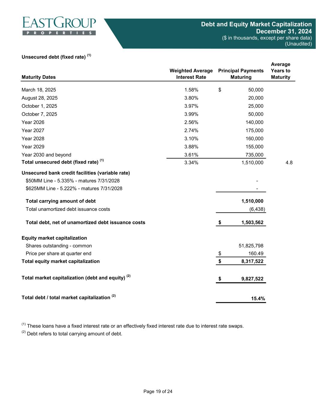 Page 2 of 24 Table of Contents Financial Information: Consolidated Balance Sheets ................................................................................ 3 Consolidated Statements of Income and Comprehensive Income ......................... 4 Reconciliations of GAAP to Non-GAAP Measures ................................................. 5 Consolidated Statements of Cash Flows ................................................................ 7 Same Property Portfolio Analysis ........................................................................... 8 Additional Financial Information ............................................................................. 9 Financial Statistics ................................................................................................. 10 Capital Deployment: Development and Value-Add Properties Summary ................................................ 11 Development and Value-Add Properties Transferred to Real Estate Properties ..... 12 Acquisitions and Dispositions ................................................................................. 13 Real Estate Improvements and Leasing Costs ....................................................... 14 Property Information: Leasing Statistics and Occupancy Summary ......................................................... 15 Core Market Operating Statistics ........................................................................... 16 Lease Expiration Summary .................................................................................... 17 Top 10 Customers by Annualized Base Rent ......................................................... 18 Capitalization: Debt and Equity Market Capitalization ................................................................... 19 Continuous Common Equity Program .................................................................... 20 Debt-to-EBITDAre Ratios ....................................................................................... 21 Other Information: Outlook for 2025 .................................................................................................... 22 Glossary of REIT Terms ........................................................................................ 23 FORWARD-LOOKING STATEMENTS The statements and certain other information contained herein, which can be identified by the use of forward-looking terminology such as “may,” “will,” “seek,” “expects,” “anticipates,” “believes,” “targets,” “intends,” “should,” “estimates,” “could,” “continue,” “assume,” “projects,” “goals” “plans” or variations of such words and similar expressions or the negative of such words, constitute “forward-looking statements” within the meaning of Section 27A of the Securities Act of 1933, as amended, and Section 21E of the Securities Exchange Act of 1934, as amended, and are subject to the safe harbors created thereby. These forward-looking statements reflect the current views of EastGroup Properties, Inc. (the “Company” or “EastGroup”) about its plans, intentions, expectations, strategies, and prospects, which are based on the information currently available to the Company and on assumptions it has made. For instance, the amount, timing and frequency of future dividends is subject to authorization by the Company’s Board of Directors and will be based upon a variety of factors. Although the Company believes that its plans, intentions, expectations, strategies and prospects as reflected in or suggested by those forward-looking statements are reasonable, the Company can give no assurance that such plans, intentions, expectations, or strategies will be attained or achieved. Furthermore, these forward-looking statements should be considered as subject to the many risks and uncertainties that exist in the Company’s operations and business environment. Such risks and uncertainties could cause actual results to differ materially from those projected. These uncertainties include, but are not limited to: international, national, regional and local economic conditions; the competitive environment in which the Company operates; fluctuations of occupancy or rental rates; potential defaults (including bankruptcies or insolvency) on or non-renewal of leases by tenants, or our ability to lease space at current or anticipated rents, particularly in light of ongoing interest rate uncertainty; disruption in supply and delivery chains; increased construction and development costs, including as a result of the recent inflationary environment; acquisition and development risks, including failure of such acquisitions and development projects to perform in accordance with our projections or to materialize at all; potential changes in the law or governmental regulations and interpretations of those laws and regulations, including changes in real estate laws, Real Estate Investment Trust (“REIT”) or corporate income tax laws, potential changes in zoning laws, or increases in real property tax rates, and any related increased cost of compliance; our ability to maintain our qualification as a REIT; natural disasters such as fires, floods, tornadoes, hurricanes, earthquakes, or other extreme weather events, which may or may not be caused by longer-term shifts in climate patterns, could destroy buildings and damage regional economies; the availability of financing and capital, increases in or long-term elevated interest rates, and our ability to raise equity capital on attractive terms; financing risks, including the risks that our cash flows from operations may be insufficient to meet required payments of principal and interest, and we may be unable to refinance our existing debt upon maturity or obtain new financing on attractive terms or at all; our ability to retain our credit agency ratings; our ability to comply with applicable financial covenants; credit risk in the event of non-