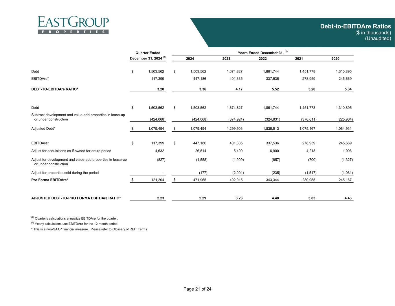 Page 21 of 24 Debt-to-EBITDAre Ratios ($ in thousands) (Unaudited) Quarter Ended December 31, 2024 (1) 2024 2023 2022 2021 2020 Debt 1,503,562$ 1,503,562$ 1,674,827 1,861,744 1,451,778 1,310,895 EBITDAre* 117,399 447,186 401,335 337,536 278,959 245,669 DEBT-TO-EBITDAre RATIO* 3.20 3.36 4.17 5.52 5.20 5.34 Debt 1,503,562$ 1,503,562$ 1,674,827 1,861,744 1,451,778 1,310,895 Subtract development and value-add properties in lease-up or under construction (424,068) (424,068) (374,924) (324,831) (376,611) (225,964) Adjusted Debt* 1,079,494$ 1,079,494$ 1,299,903 1,536,913 1,075,167 1,084,931 EBITDAre* 117,399$ 447,186$ 401,335 337,536 278,959 245,669 Adjust for acquisitions as if owned for entire period 4,632 26,514 5,490 6,900 4,213 1,906 Adjust for development and value-add properties in lease-up or under construction (827) (1,558) (1,909) (857) (700) (1,327) Adjust for properties sold during the period - (177) (2,001) (235) (1,517) (1,081) Pro Forma EBITDAre* 121,204$ 471,965$ 402,915 343,344 280,955 245,167 ADJUSTED DEBT-TO-PRO FORMA EBITDAre RATIO* 2.23 2.29 3.23 4.48 3.83 4.43 (1) Quarterly calculations annualize EBITDAre for the quarter. (2) Yearly calculations use EBITDAre for the 12-month period. * This is a non-GAAP financial measure. Please refer to Glossary of REIT Terms. Years Ended December 31, (2)