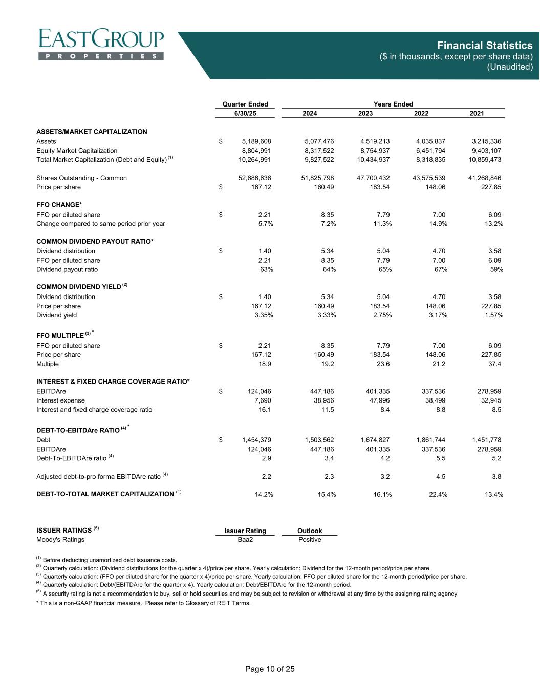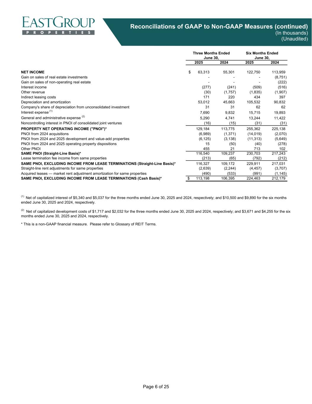 Page 5 of 25 Reconciliations of GAAP to Non-GAAP Measures (In thousands, except per share data) (Unaudited) 2025 2024 2025 2024 NET INCOME ATTRIBUTABLE TO EASTGROUP PROPERTIES, INC. COMMON STOCKHOLDERS 63,299$ 55,287 122,722 113,931 Depreciation and amortization 53,012 45,663 105,532 90,832 Company's share of depreciation from unconsolidated investment 31 31 62 62 Depreciation and amortization attributable to noncontrolling interest (1) (1) (2) (2) Gain on sales of real estate investments - - - (8,751) Gain on sales of non-operating real estate - - - (222) FUNDS FROM OPERATIONS ("FFO") ATTRIBUTABLE TO COMMON STOCKHOLDERS* 116,341 100,980 228,314 195,850 Gain on involuntary conversion and business interruption claims - (1,708) (1,763) (1,708) FFO ATTRIBUTABLE TO COMMON STOCKHOLDERS, EXCLUDING GAIN ON INVOLUNTARY CONVERSION AND BUSINESS INTERRUPTION CLAIMS* 116,341$ 99,272 226,551 194,142 NET INCOME 63,313$ 55,301 122,750 113,959 Interest expense (1) 7,690 9,832 15,715 19,893 Depreciation and amortization 53,012 45,663 105,532 90,832 Company's share of depreciation from unconsolidated investment 31 31 62 62 EARNINGS BEFORE INTEREST, TAXES, DEPRECIATION AND AMORTIZATION ("EBITDA") 124,046 110,827 244,059 224,746 Gain on sales of real estate investments - - - (8,751) Gain on sales of non-operating real estate - - - (222) EBITDA FOR REAL ESTATE ("EBITDAre")* 124,046$ 110,827 244,059 215,773 DILUTED PER COMMON SHARE DATA FOR EASTGROUP PROPERTIES, INC. COMMON STOCKHOLDERS Net income attributable to common stockholders 1.20$ 1.14 2.35 2.37 FFO attributable to common stockholders* 2.21$ 2.09 4.37 4.07 FFO attributable to common stockholders, excluding gain on involuntary conversion and business interruption claims* 2.21$ 2.05 4.33 4.03 Weighted average shares outstanding for EPS and FFO purposes - Diluted 52,579 48,345 52,304 48,153 June 30, * This is a non-GAAP financial measure. Please refer to Glossary of REIT Terms. Three Months Ended June 30, Six Months Ended (1) Net of capitalized interest of $5,340 and $5,037 for the three months ended June 30, 2025 and 2024, respectively; and $10,500 and $9,890 for the six months ended June 30, 2025 and 2024, respectively.