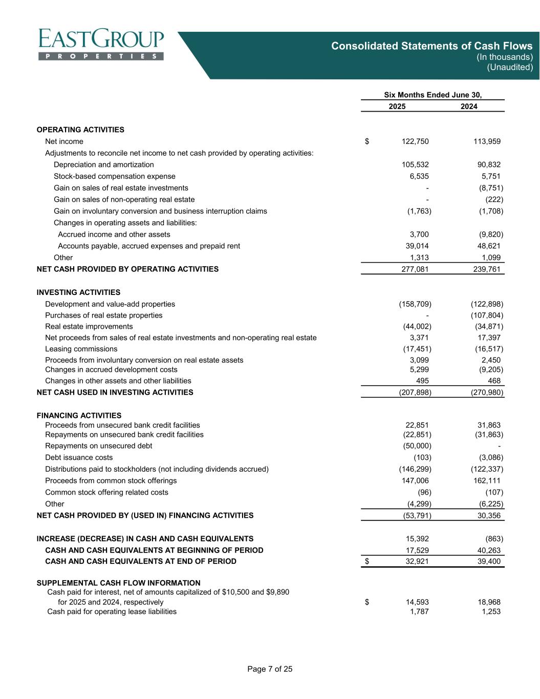 Page 7 of 25 Consolidated Statements of Cash Flows (In thousands) (Unaudited) 2025 2024 OPERATING ACTIVITIES Net income 122,750$ 113,959 Adjustments to reconcile net income to net cash provided by operating activities: Depreciation and amortization 105,532 90,832 Stock-based compensation expense 6,535 5,751 Gain on sales of real estate investments - (8,751) Gain on sales of non-operating real estate - (222) Gain on involuntary conversion and business interruption claims (1,763) (1,708) Changes in operating assets and liabilities: Accrued income and other assets 3,700 (9,820) Accounts payable, accrued expenses and prepaid rent 39,014 48,621 Other 1,313 1,099 NET CASH PROVIDED BY OPERATING ACTIVITIES 277,081 239,761 INVESTING ACTIVITIES Development and value-add properties (158,709) (122,898) Purchases of real estate properties - (107,804) Real estate improvements (44,002) (34,871) Net proceeds from sales of real estate investments and non-operating real estate 3,371 17,397 Leasing commissions (17,451) (16,517) Proceeds from involuntary conversion on real estate assets 3,099 2,450 Changes in accrued development costs 5,299 (9,205) Changes in other assets and other liabilities 495 468 NET CASH USED IN INVESTING ACTIVITIES (207,898) (270,980) FINANCING ACTIVITIES Proceeds from unsecured bank credit facilities 22,851 31,863 Repayments on unsecured bank credit facilities (22,851) (31,863) Repayments on unsecured debt (50,000) - Debt issuance costs (103) (3,086) Distributions paid to stockholders (not including dividends accrued) (146,299) (122,337) Proceeds from common stock offerings 147,006 162,111 Common stock offering related costs (96) (107) Other (4,299) (6,225) NET CASH PROVIDED BY (USED IN) FINANCING ACTIVITIES (53,791) 30,356 INCREASE (DECREASE) IN CASH AND CASH EQUIVALENTS 15,392 (863) CASH AND CASH EQUIVALENTS AT BEGINNING OF PERIOD 17,529 40,263 CASH AND CASH EQUIVALENTS AT END OF PERIOD 32,921$ 39,400 SUPPLEMENTAL CASH FLOW INFORMATION Cash paid for interest, net of amounts capitalized of $10,500 and $9,890 for 2025 and 2024, respectively 14,593$ 18,968 Cash paid for operating lease liabilities 1,787 1,253 Six Months Ended June 30,