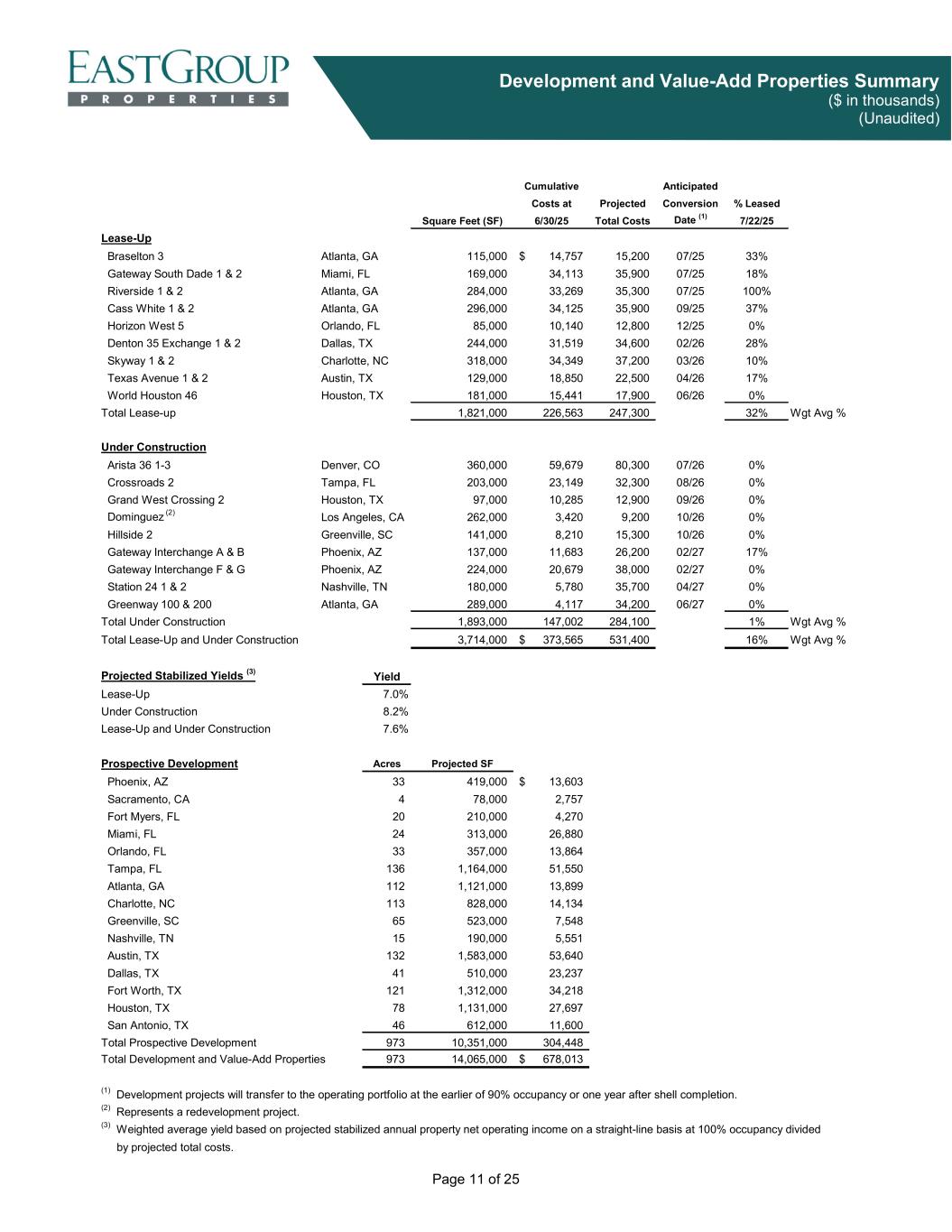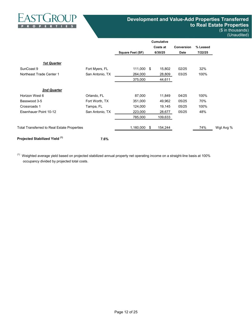 Page 11 of 25 Development and Value-Add Properties Summary ($ in thousands) (Unaudited) Cumulative Anticipated Costs at Projected Conversion % Leased Square Feet (SF) 6/30/25 Total Costs Date (1) 7/22/25 Lease-Up Braselton 3 Atlanta, GA 115,000 14,757$ 15,200 07/25 33% Gateway South Dade 1 & 2 Miami, FL 169,000 34,113 35,900 07/25 18% Riverside 1 & 2 Atlanta, GA 284,000 33,269 35,300 07/25 100% Cass White 1 & 2 Atlanta, GA 296,000 34,125 35,900 09/25 37% Horizon West 5 Orlando, FL 85,000 10,140 12,800 12/25 0% Denton 35 Exchange 1 & 2 Dallas, TX 244,000 31,519 34,600 02/26 28% Skyway 1 & 2 Charlotte, NC 318,000 34,349 37,200 03/26 10% Texas Avenue 1 & 2 Austin, TX 129,000 18,850 22,500 04/26 17% World Houston 46 Houston, TX 181,000 15,441 17,900 06/26 0% Total Lease-up 1,821,000 226,563 247,300 32% Wgt Avg % Under Construction Arista 36 1-3 Denver, CO 360,000 59,679 80,300 07/26 0% Crossroads 2 Tampa, FL 203,000 23,149 32,300 08/26 0% Grand West Crossing 2 Houston, TX 97,000 10,285 12,900 09/26 0% Dominguez (2) Los Angeles, CA 262,000 3,420 9,200 10/26 0% Hillside 2 Greenville, SC 141,000 8,210 15,300 10/26 0% Gateway Interchange A & B Phoenix, AZ 137,000 11,683 26,200 02/27 17% Gateway Interchange F & G Phoenix, AZ 224,000 20,679 38,000 02/27 0% Station 24 1 & 2 Nashville, TN 180,000 5,780 35,700 04/27 0% Greenway 100 & 200 Atlanta, GA 289,000 4,117 34,200 06/27 0% Total Under Construction 1,893,000 147,002 284,100 1% Wgt Avg % Total Lease-Up and Under Construction 3,714,000 373,565$ 531,400 16% Wgt Avg % Projected Stabilized Yields (3) Yield Lease-Up 7.0% Under Construction 8.2% Lease-Up and Under Construction 7.6% Prospective Development Acres Projected SF Phoenix, AZ 33 419,000 13,603$ Sacramento, CA 4 78,000 2,757 Fort Myers, FL 20 210,000 4,270 Miami, FL 24 313,000 26,880 Orlando, FL 33 357,000 13,864 Tampa, FL 136 1,164,000 51,550 Atlanta, GA 112 1,121,000 13,899 Charlotte, NC 113 828,000 14,134 Greenville, SC 65 523,000 7,548 Nashville, TN 15 190,000 5,551 Austin, TX 132 1,583,000 53,640 Dallas, TX 41 510,000 23,237 Fort Worth, TX 121 1,312,000 34,218 Houston, TX 78 1,131,000 27,697 San Antonio, TX 46 612,000 11,600 Total Prospective Development 973 10,351,000 304,448 Total Development and Value-Add Properties 973 14,065,000 678,013$ (1) Development projects will transfer to the operating portfolio at the earlier of 90% occupancy or one year after shell completion. (2) Represents a redevelopment project. (3) Weighted average yield based on projected stabilized annual property net operating income on a straight-line basis at 100% occupancy divided by projected total costs.