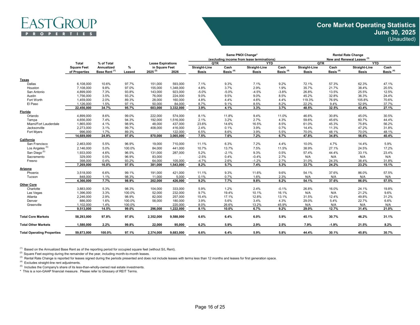 Page 16 of 25 Core Market Operating Statistics June 30, 2025 (Unaudited) Total % of Total Square Feet Annualized % Straight-Line Cash Straight-Line Cash Straight-Line Cash Straight-Line Cash of Properties Base Rent (1) Leased 2025 (2) 2026 Basis Basis (4) Basis Basis (4) Basis Basis (4) Basis Basis (4) Texas Dallas 6,108,000 10.6% 97.7% 151,000 593,000 7.1% 9.3% 7.1% 9.2% 72.1% 57.3% 62.3% 47.1% Houston 7,108,000 9.8% 97.0% 155,000 1,348,000 4.8% 3.7% 2.9% 1.9% 35.7% 21.7% 38.4% 20.5% San Antonio 4,899,000 7.3% 93.8% 143,000 923,000 -5.0% -5.0% -4.5% -3.8% 26.8% 13.5% 25.5% 12.5% Austin 1,756,000 3.5% 93.2% 76,000 224,000 9.0% 9.5% 9.0% 8.5% 45.2% 32.8% 36.3% 24.4% Fort Worth 1,459,000 2.0% 89.3% 28,000 160,000 4.8% 4.4% 4.6% 4.4% 119.3% 76.9% 105.8% 70.6% El Paso 1,126,000 1.5% 97.1% 50,000 84,000 8.7% 9.1% 8.5% 8.2% 22.2% 9.4% 52.9% 37.7% 22,456,000 34.7% 95.7% 603,000 3,332,000 3.9% 4.1% 3.3% 3.7% 48.5% 32.5% 43.4% 27.1% Florida Orlando 4,899,000 8.6% 99.0% 222,000 574,000 8.1% 11.8% 9.4% 11.0% 46.6% 30.8% 45.0% 30.5% Tampa 4,656,000 7.4% 94.3% 192,000 1,516,000 2.1% 3.2% 2.7% 4.3% 59.6% 45.6% 60.7% 44.4% Miami/Fort Lauderdale 1,865,000 4.1% 98.9% 48,000 437,000 23.6% 14.6% 16.5% 8.5% 61.0% 45.3% 75.8% 56.2% Jacksonville 2,273,000 3.1% 99.7% 408,000 416,000 2.4% 0.1% 3.9% 0.7% 14.4% 11.3% 47.2% 31.8% Fort Myers 996,000 1.7% 89.3% - 122,000 6.5% 8.6% 3.9% 5.5% 70.0% 48.1% 70.0% 48.1% 14,689,000 24.9% 97.0% 870,000 3,065,000 7.5% 7.6% 7.2% 6.7% 47.8% 34.8% 56.6% 40.4% California San Francisco 2,463,000 5.5% 96.9% 19,000 710,000 11.1% 6.3% 7.2% 4.4% 10.0% 4.7% 14.4% 5.9% Los Angeles (5) 2,146,000 5.0% 100.0% 84,000 441,000 10.7% 13.7% 7.5% 11.5% 38.9% 27.1% 24.5% 17.2% San Diego (5) 1,933,000 4.6% 96.5% 131,000 287,000 5.2% -2.1% 9.3% 0.5% 57.4% 44.4% 33.1% 23.4% Sacramento 329,000 0.5% 96.9% 83,000 - -2.5% 0.4% -0.4% 2.7% N/A N/A N/A N/A Fresno 398,000 0.4% 93.2% 64,000 105,000 -4.7% 2.6% -1.2% 2.7% 31.0% 24.3% 38.4% 31.8% 7,269,000 16.0% 97.5% 381,000 1,543,000 8.2% 5.7% 7.4% 5.3% 33.7% 24.2% 23.2% 15.1% Arizona Phoenix 3,518,000 6.6% 99.1% 191,000 421,000 11.1% 9.3% 11.6% 9.6% 54.1% 37.6% 86.0% 57.5% Tucson 848,000 1.1% 98.3% 11,000 5,000 0.1% 0.7% 1.6% 2.3% N/A N/A N/A N/A 4,366,000 7.7% 98.9% 202,000 426,000 9.2% 7.7% 9.8% 8.2% 54.1% 37.6% 86.0% 57.5% Other Core Charlotte 3,883,000 5.3% 98.3% 104,000 333,000 5.9% 1.2% 2.4% -0.1% 26.8% 16.0% 24.1% 19.8% Las Vegas 1,396,000 3.3% 100.0% 52,000 232,000 9.7% 19.4% 10.1% 16.1% N/A N/A 21.2% 9.6% Atlanta 2,246,000 2.9% 98.9% 82,000 257,000 15.4% 17.1% 12.8% 13.1% 31.5% 12.4% 49.8% 31.2% Denver 886,000 1.6% 100.0% 58,000 180,000 3.9% 5.6% 3.4% 4.3% 29.0% 5.4% 22.7% 6.6% Greenville 1,102,000 1.4% 100.0% - 220,000 8.0% 26.6% 13.2% 45.9% N/A N/A N/A N/A 9,513,000 14.5% 99.0% 296,000 1,222,000 8.1% 10.0% 6.7% 9.2% 29.0% 12.7% 31.4% 21.0% Total Core Markets 58,293,000 97.8% 97.0% 2,352,000 9,588,000 6.6% 6.4% 6.0% 5.9% 45.1% 30.7% 46.2% 31.1% Total Other Markets 1,580,000 2.2% 99.8% 22,000 95,000 6.2% 5.9% 2.9% 2.5% 7.9% -1.9% 21.5% 8.2% Total Operating Properties 59,873,000 100.0% 97.1% 2,374,000 9,683,000 6.6% 6.4% 5.9% 5.8% 44.4% 30.1% 45.8% 30.7% (1) Based on the Annualized Base Rent as of the reporting period for occupied square feet (without S/L Rent). (2) Square Feet expiring during the remainder of the year, including month-to-month leases. (3) Rental Rate Change is reported for leases signed during the periods presented and does not include leases with terms less than 12 months and leases for first generation space. (4) Excludes straight-line rent adjustments. (5) Includes the Company's share of its less-than-wholly-owned real estate investments. * This is a non-GAAP financial measure. Please refer to Glossary of REIT Terms. in Square Feet Same PNOI Change* Rental Rate Change (excluding income from lease terminations) New and Renewal Leases (3) Lease Expirations QTR YTD QTR YTD