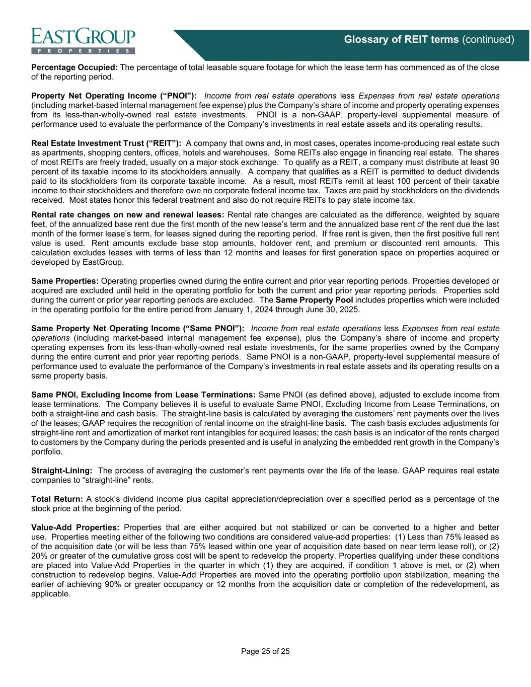 Page 25 of 25 Glossary of REIT terms (continued) Percentage Occupied: The percentage of total leasable square footage for which the lease term has commenced as of the close of the reporting period. Property Net Operating Income (“PNOI”): Income from real estate operations less Expenses from real estate operations (including market-based internal management fee expense) plus the Company’s share of income and property operating expenses from its less-than-wholly-owned real estate investments. PNOI is a non-GAAP, property-level supplemental measure of performance used to evaluate the performance of the Company’s investments in real estate assets and its operating results. Real Estate Investment Trust (“REIT”): A company that owns and, in most cases, operates income-producing real estate such as apartments, shopping centers, offices, hotels and warehouses. Some REITs also engage in financing real estate. The shares of most REITs are freely traded, usually on a major stock exchange. To qualify as a REIT, a company must distribute at least 90 percent of its taxable income to its stockholders annually. A company that qualifies as a REIT is permitted to deduct dividends paid to its stockholders from its corporate taxable income. As a result, most REITs remit at least 100 percent of their taxable income to their stockholders and therefore owe no corporate federal income tax. Taxes are paid by stockholders on the dividends received. Most states honor this federal treatment and also do not require REITs to pay state income tax. Rental rate changes on new and renewal leases: Rental rate changes are calculated as the difference, weighted by square feet, of the annualized base rent due the first month of the new lease’s term and the annualized base rent of the rent due the last month of the former lease’s term, for leases signed during the reporting period. If free rent is given, then the first positive full rent value is used. Rent amounts exclude base stop amounts, holdover rent, and premium or discounted rent amounts. This calculation excludes leases with terms of less than 12 months and leases for first generation space on properties acquired or developed by EastGroup. Same Properties: Operating properties owned during the entire current and prior year reporting periods. Properties developed or acquired are excluded until held in the operating portfolio for both the current and prior year reporting periods. Properties sold during the current or prior year reporting periods are excluded. The Same Property Pool includes properties which were included in the operating portfolio for the entire period from January 1, 2024 through June 30, 2025. Same Property Net Operating Income (“Same PNOI”): Income from real estate operations less Expenses from real estate operations (including market-based internal management fee expense), plus the Company’s share of income and property operating expenses from its less-than-wholly-owned real estate investments, for the same properties owned by the Company during the entire current and prior year reporting periods. Same PNOI is a non-GAAP, property-level supplemental measure of performance used to evaluate the performance of the Company’s investments in real estate assets and its operating results on a same property basis. Same PNOI, Excluding Income from Lease Terminations: Same PNOI (as defined above), adjusted to exclude income from lease terminations. The Company believes it is useful to evaluate Same PNOI, Excluding Income from Lease Terminations, on both a straight-line and cash basis. The straight-line basis is calculated by averaging the customers’ rent payments over the lives of the leases; GAAP requires the recognition of rental income on the straight-line basis. The cash basis excludes adjustments for straight-line rent and amortization of market rent intangibles for acquired leases; the cash basis is an indicator of the rents charged to customers by the Company during the periods presented and is useful in analyzing the embedded rent growth in the Company’s portfolio. Straight-Lining: The process of averaging the customer’s rent payments over the life of the lease. GAAP requires real estate companies to “straight-line” rents. Total Return: A stock’s dividend income plus capital appreciation/depreciation over a specified period as a percentage of the stock price at the beginning of the period. Value-Add Properties: Properties that are either acquired but not stabilized or can be converted to a higher and better use. Properties meeting either of the following two conditions are considered value-add properties: (1) Less than 75% leased as of the acquisition date (or will be less than 75% leased within one year of acquisition date based on near term lease roll), or (2) 20% or greater of the cumulative gross cost will be spent to redevelop the property. Properties qualifying under these conditions are placed into Value-Add Properties in the quarter in which (1) they are acquired, if condition 1 above is met, or (2) when construction to redevelop begins. Value-Add Properties are moved into the operating portfolio upon stabilization, meaning the earlier of achieving 90% or greater occupancy or 12 months from the acquisition date or completion of the redevelopment, as applicable.