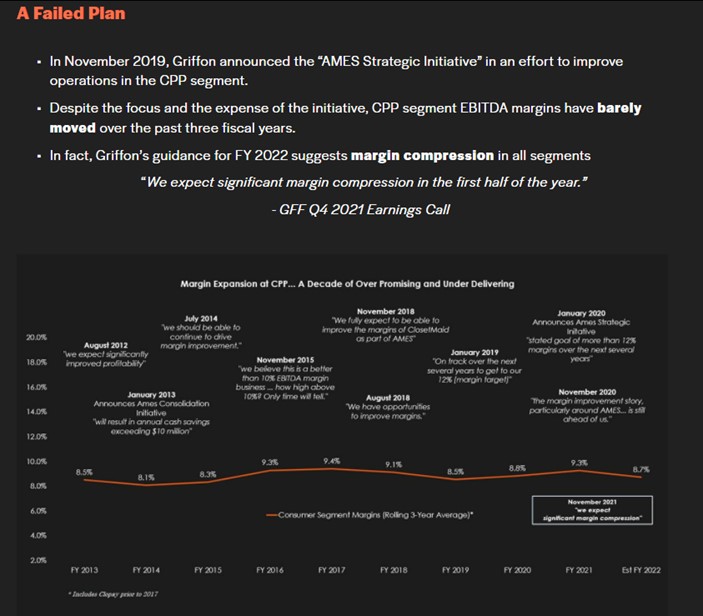 It is easy to improve margins through buying higher-margin businesses, such as Hunter Fan. What Griffon’s deck neglects to demonstrate is what proportion of margin improvement is actually attributable to high-margin acquisitions versus internal improvements once a company was acquired. We suspect internal improvements are relatively small, as shown by results at CPP.