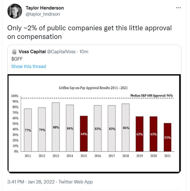 The reality is Griffon has not been responsive to shareholder concerns surrounding executive compensation. Despite the benefit of the insider ownership, as well as its large ESOP Plan, the Company has seen recurring shareholder dissatisfaction over its pay practices. The Company only spoke to shareholders owning 9% of outstanding shares in all of 2021. This is a surprising fact considering the number of Griffon institutional shareholders that have not only voted against Say on Pay, but also against unopposed incumbent Board members.