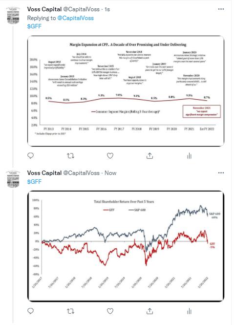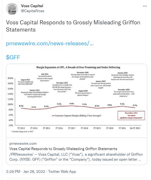 HOUSTON, Jan. 28, 2022 /PRNewswire/ -- Voss Capital, LLC ("Voss"), a significant shareholder of Griffon Corp. (NYSE: GFF) ("Griffon" or the "Company"), today issued an open letter to Griffon shareholders, which responds to several misleading statements and mischaracterizations made by Griffon in its recent investor presentation.