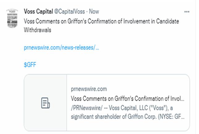 Voss Comments on Griffon’s Confirmation of Involvement in Candidate Withdrawals