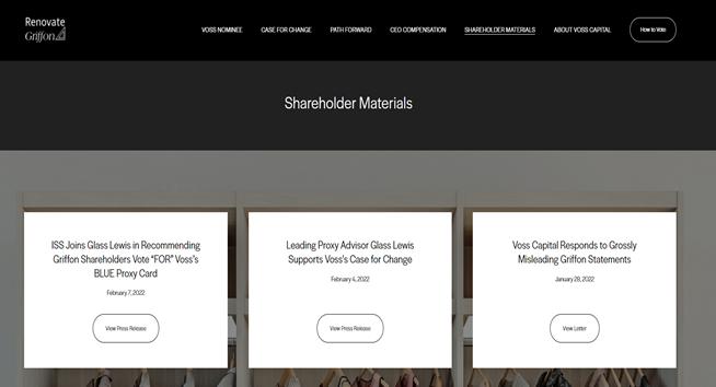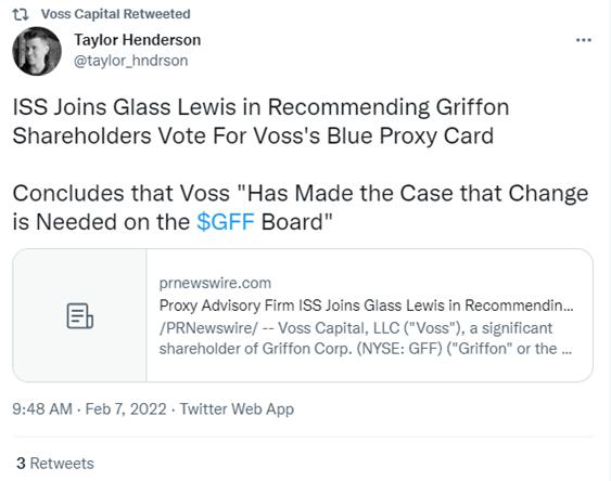 Voss greatly appreciates ISS’s and Glass Lewis’s support of our nominee Charlie Diao and the case for change at Griffon. Both proxy advisory firms have shared our concerns regarding the Company’s persistent underperformance, outsized executive compensation, lack of Board independence and outdated corporate governance practices.