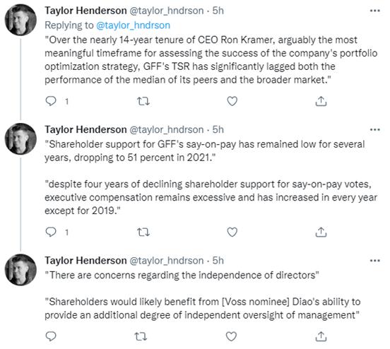 | · | “Shareholder support for GFF's say-on-pay has remained low for several years, dropping to 51 percent in 2021.” |