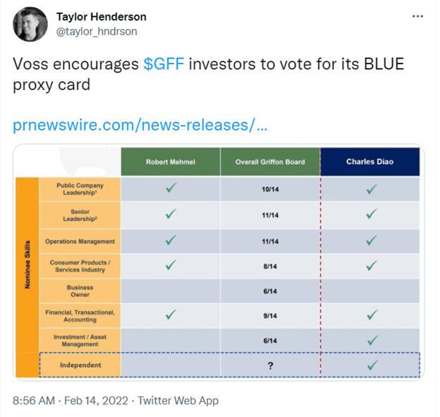 Voss Value Master Fund, LP, a Cayman Islands limited partnership (“Voss Value Master Fund”), together with the other participants named herein (collectively, “Voss”), has filed a definitive proxy statement and accompanying BLUE proxy card with the Securities and Exchange Commission (“SEC”) to be used to solicit votes for the election of its highly-qualified director nominee at the 2022 annual meeting of stockholders of Griffon Corporation, a Delaware corporation (the “Company”).