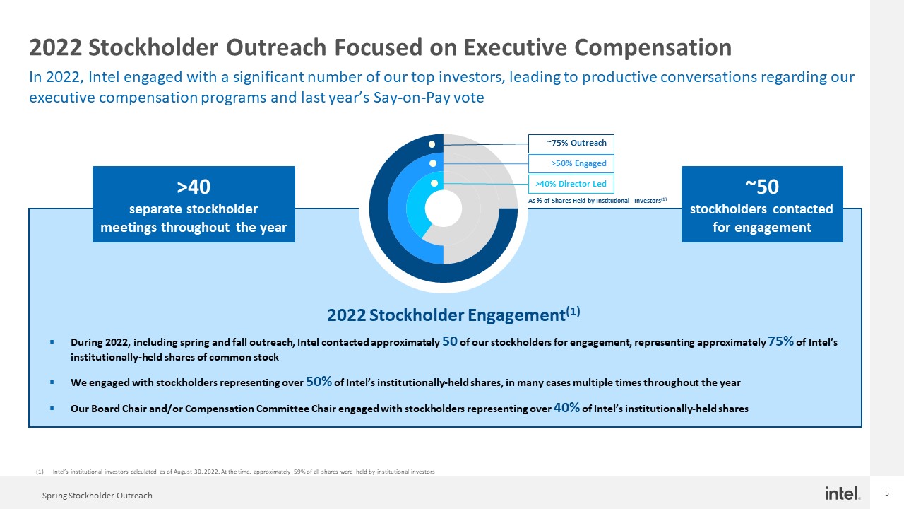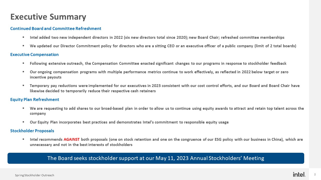 for stockholder re-approval); purpose and effects of any stock or compensation related policies; dividends; board responsiveness to stockholder concerns; 2030 RISE framework, reporting and goals (including any commitments for