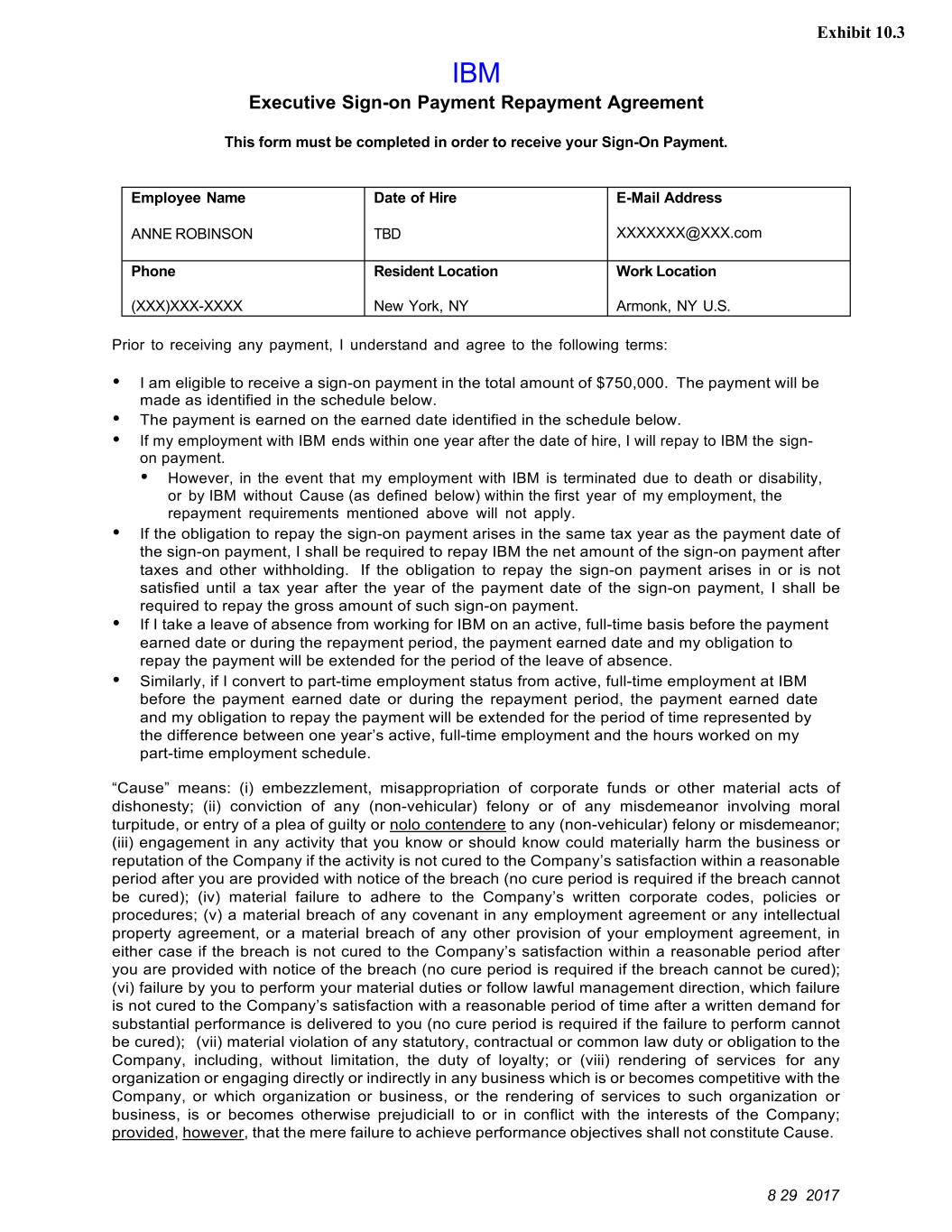 8 29 2017 Exhibit 10.3 IBM Executive Sign-on Payment Repayment Agreement This form must be completed in order to receive your Sign-On Payment. Employee Name ANNE ROBINSON Date of Hire TBD E-Mail Address XXXXXXX@XXX.com Phone (XXX)XXX-XXXX Resident Location New York, NY Work Location Armonk, NY U.S. Prior to receiving any payment, I understand and agree to the following terms: Ÿ I am eligible to receive a sign-on payment in the total amount of $750,000. The payment will be made as identified in the schedule below. Ÿ The payment is earned on the earned date identified in the schedule below. Ÿ If my employment with IBM ends within one year after the date of hire, I will repay to IBM the sign- on payment. Ÿ However, in the event that my employment with IBM is terminated due to death or disability, or by IBM without Cause (as defined below) within the first year of my employment, the repayment requirements mentioned above will not apply. Ÿ If the obligation to repay the sign-on payment arises in the same tax year as the payment date of the sign-on payment, I shall be required to repay IBM the net amount of the sign-on payment after taxes and other withholding. If the obligation to repay the sign-on payment arises in or is not satisfied until a tax year after the year of the payment date of the sign-on payment, I shall be required to repay the gross amount of such sign-on payment. Ÿ If I take a leave of absence from working for IBM on an active, full-time basis before the payment earned date or during the repayment period, the payment earned date and my obligation to repay the payment will be extended for the period of the leave of absence. Ÿ Similarly, if I convert to part-time employment status from active, full-time employment at IBM before the payment earned date or during the repayment period, the payment earned date and my obligation to repay the payment will be extended for the period of time represented by the difference between one year’s active, full-time employment and the hours worked on my part-time employment schedule. “Cause” means: (i) embezzlement, misappropriation of corporate funds or other material acts of dishonesty; (ii) conviction of any (non-vehicular) felony or of any misdemeanor involving moral turpitude, or entry of a plea of guilty or nolo contendere to any (non-vehicular) felony or misdemeanor; (iii) engagement in any activity that you know or should know could materially harm the business or reputation of the Company if the activity is not cured to the Company’s satisfaction within a reasonable period after you are provided with notice of the breach (no cure period is required if the breach cannot be cured); (iv) material failure to adhere to the Company’s written corporate codes, policies or procedures; (v) a material breach of any covenant in any employment agreement or any intellectual property agreement, or a material breach of any other provision of your employment agreement, in either case if the breach is not cured to the Company’s satisfaction within a reasonable period after you are provided with notice of the breach (no cure period is required if the breach cannot be cured); (vi) failure by you to perform your material duties or follow lawful management direction, which failure is not cured to the Company’s satisfaction with a reasonable period of time after a written demand for substantial performance is delivered to you (no cure period is required if the failure to perform cannot be cured); (vii) material violation of any statutory, contractual or common law duty or obligation to the Company, including, without limitation, the duty of loyalty; or (viii) rendering of services for any organization or engaging directly or indirectly in any business which is or becomes competitive with the Company, or which organization or business, or the rendering of services to such organization or business, is or becomes otherwise prejudiciall to or in conflict with the interests of the Company; provided, however, that the mere failure to achieve performance objectives shall not constitute Cause.