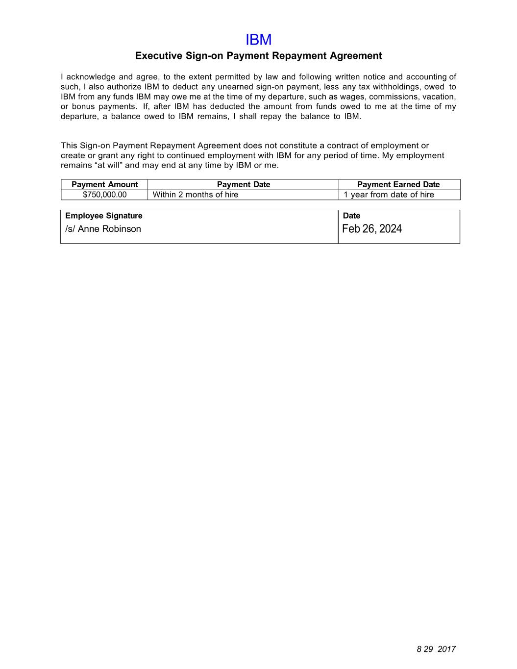 8 29 2017 IBM Executive Sign-on Payment Repayment Agreement I acknowledge and agree, to the extent permitted by law and following written notice and accounting of such, I also authorize IBM to deduct any unearned sign-on payment, less any tax withholdings, owed to IBM from any funds IBM may owe me at the time of my departure, such as wages, commissions, vacation, or bonus payments. If, after IBM has deducted the amount from funds owed to me at the time of my departure, a balance owed to IBM remains, I shall repay the balance to IBM. This Sign-on Payment Repayment Agreement does not constitute a contract of employment or create or grant any right to continued employment with IBM for any period of time. My employment remains “at will” and may end at any time by IBM or me. Payment Amount Payment Date Payment Earned Date $750,000.00 Within 2 months of hire 1 year from date of hire Employee Signature /s/ Anne Robinson