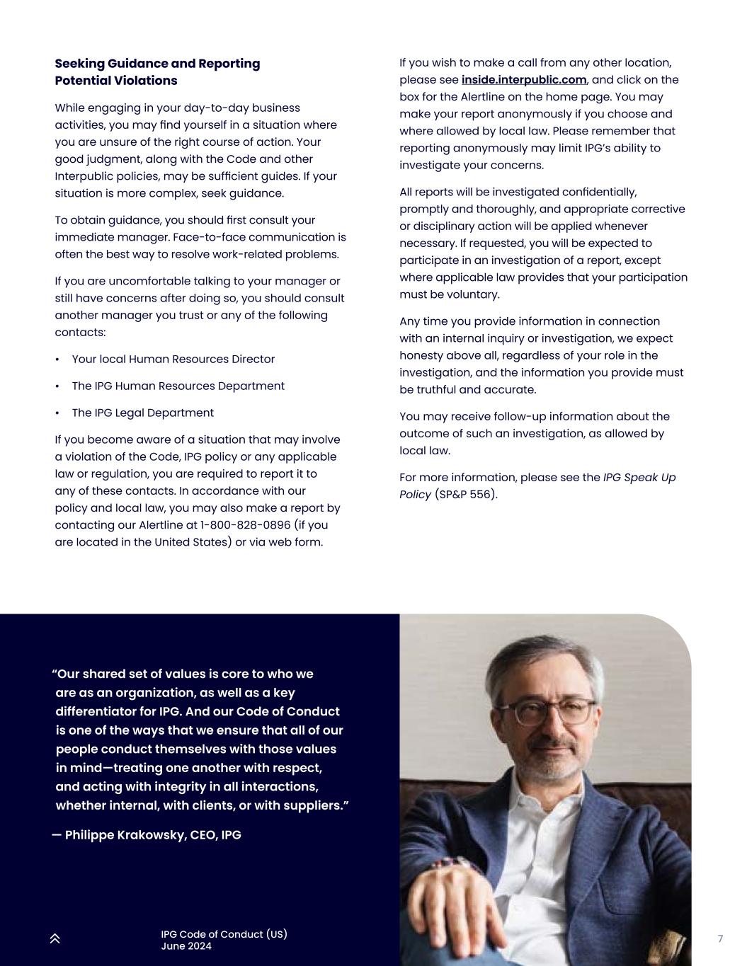 6IPG Code of Conduct (US) June 2024 Seeking Guidance and Reporting Potential Violations IPG promotes open communication at all times and encourages employees to seek guidance in instances where further clarification on the principles and policies found in the Code is needed to ensure compliance.
