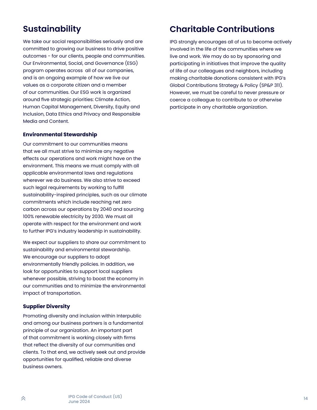 14IPG Code of Conduct (US) June 2024 Sustainability We take our social responsibilities seriously and are committed to growing our business to drive positive outcomes - for our clients, people and communities. Our Environmental, Social, and Governance (ESG) program operates across all of our companies, and is an ongoing example of how we live our values as a corporate citizen and a member of our communities. Our ESG work is organized around five strategic priorities: Climate Action, Human Capital Management, Diversity, Equity and Inclusion, Data Ethics and Privacy and Responsible Media and Content. Environmental Stewardship Our commitment to our communities means that we all must strive to minimize any negative effects our operations and work might have on the environment. This means we must comply with all applicable environmental laws and regulations wherever we do business. We also strive to exceed such legal requirements by working to fulfill sustainability-inspired principles, such as our climate commitments which include reaching net zero carbon across our operations by 2040 and sourcing 100% renewable electricity by 2030. We must all operate with respect for the environment and work to further IPG’s industry leadership in sustainability. We expect our suppliers to share our commitment to sustainability and environmental stewardship. We encourage our suppliers to adopt environmentally friendly policies. In addition, we look for opportunities to support local suppliers whenever possible, striving to boost the economy in our communities and to minimize the environmental impact of transportation. Supplier Diversity Promoting diversity and inclusion within Interpublic and among our business partners is a fundamental principle of our organization. An important part of that commitment is working closely with firms that reflect the diversity of our communities and clients. To that end, we actively seek out and provide opportunities for qualified, reliable and diverse business owners. Charitable Contributions IPG strongly encourages all of us to become actively involved in the life of the communities where we live and work. We may do so by sponsoring and participating in initiatives that improve the quality of life of our colleagues and neighbors, including making charitable donations consistent with IPG’s Global Contributions Strategy & Policy (SP&P 311). However, we must be careful to never pressure or coerce a colleague to contribute to or otherwise participate in any charitable organization.