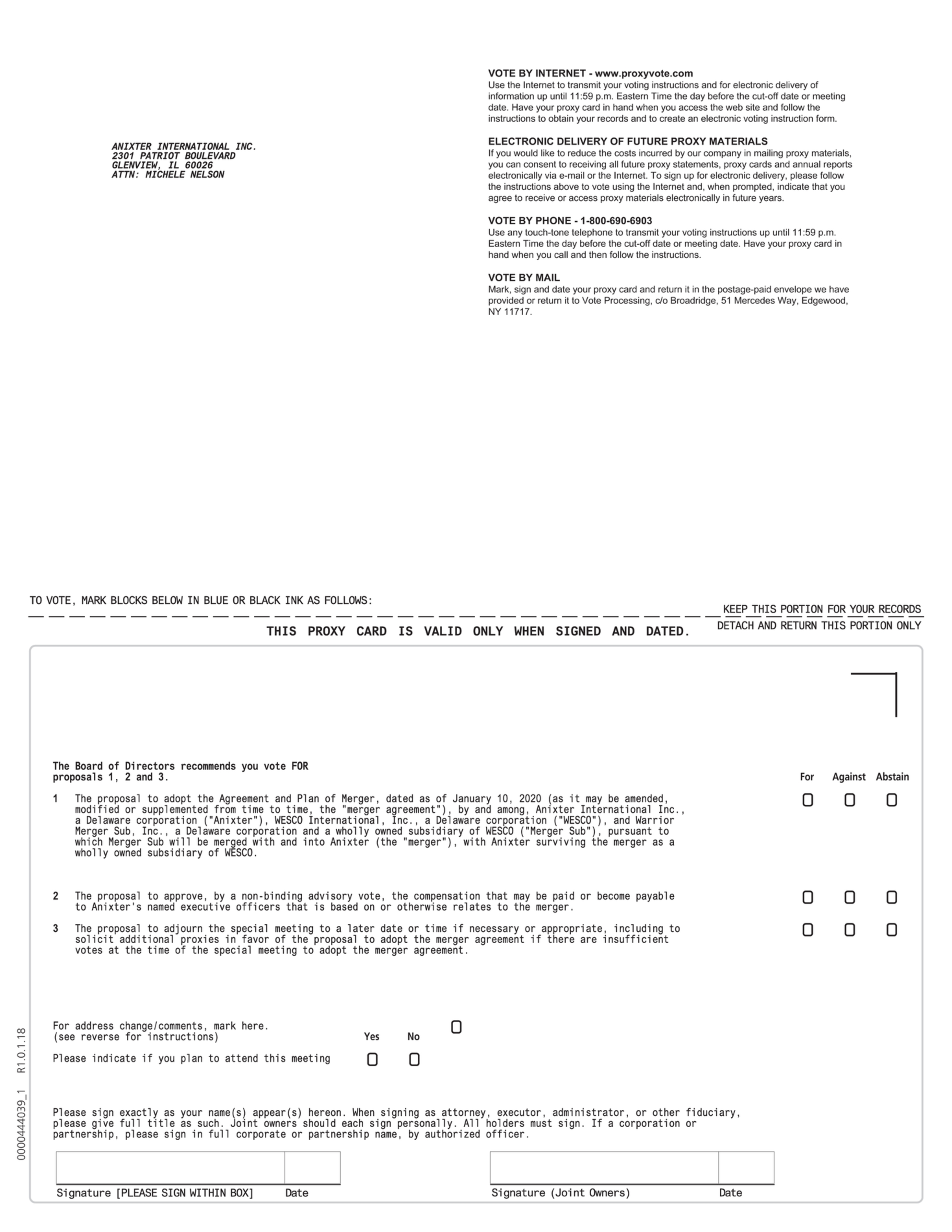 | 1. | to consider and vote on a proposal to adopt the merger agreement by and among Anixter, WESCO and Merger Sub, pursuant to which Merger Sub will be merged with and into Anixter, with Anixter surviving as a wholly owned subsidiary of WESCO; |