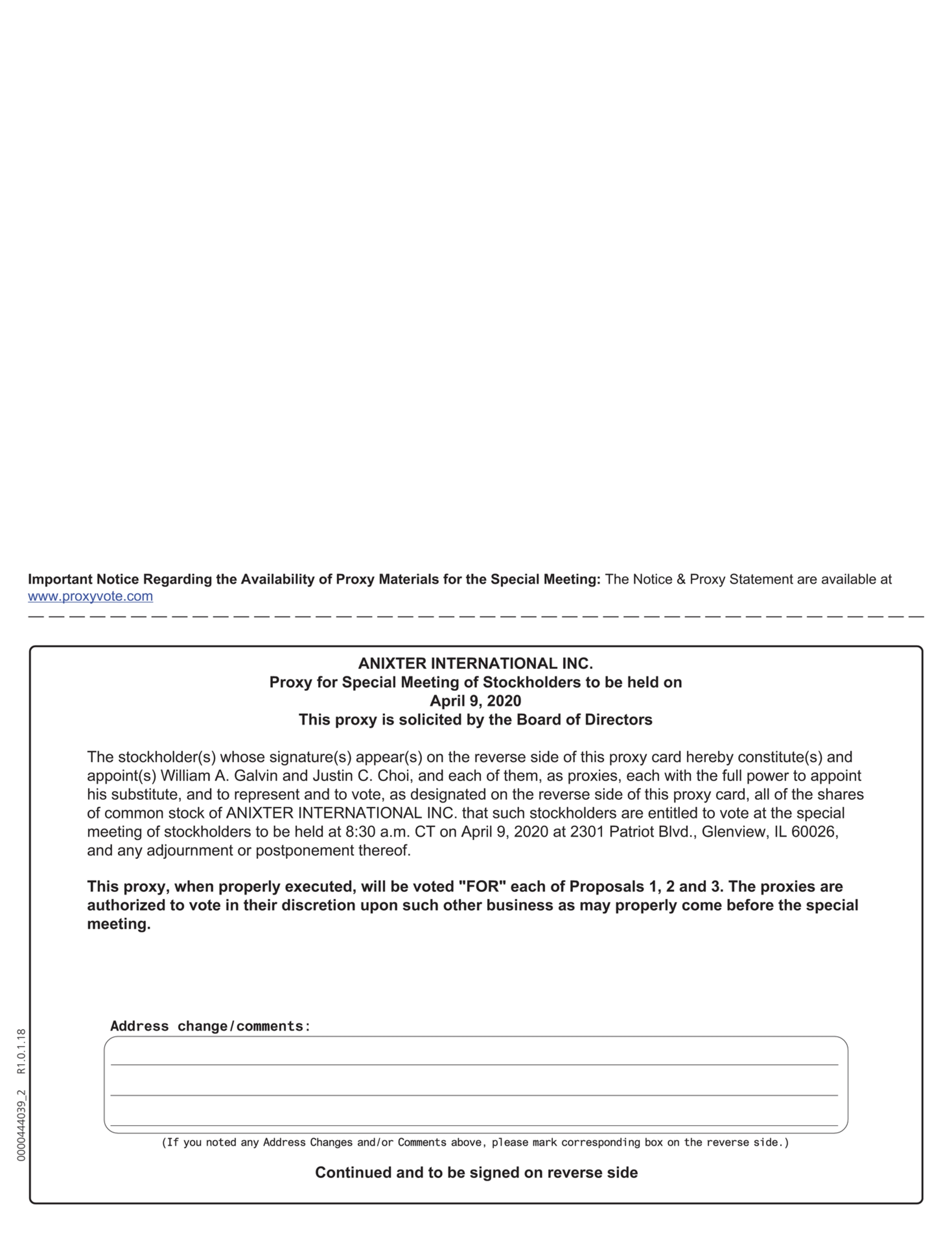A special meeting of Anixter stockholders will be held on April 9, 2020, at 8:30 a.m. Central Time at 2301 Patriot Boulevard, Glenview, Illinois 60026, for the following purposes: