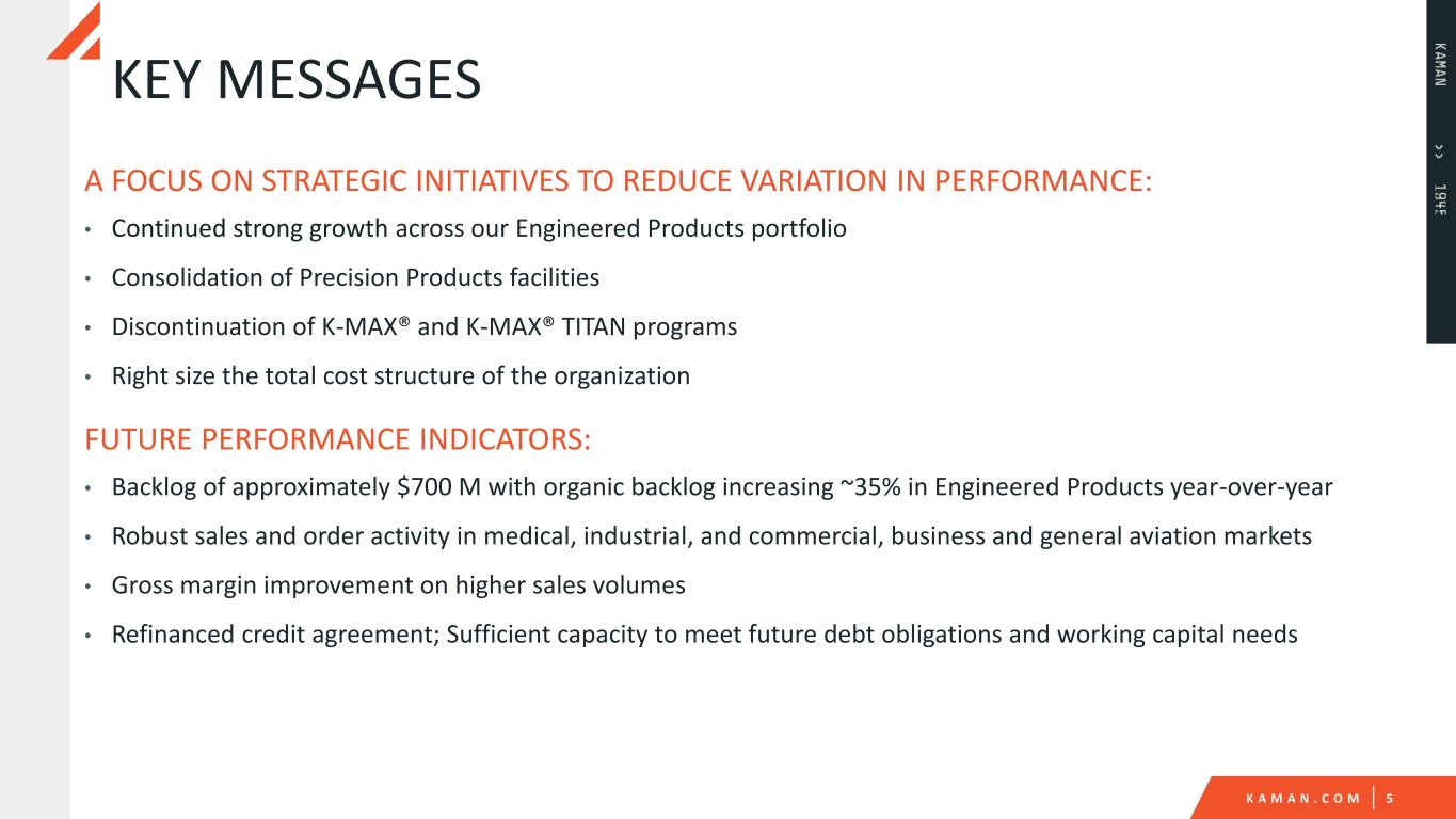 2 CAUTIONARY STATEMENT K A M A N . C O M FORWARD LOOKING STATEMENTS This presentation includes "forward looking statements" relating to the announced transactions and future operations of the Company, which can be identified by the use of words such as “will,” “expect,” “poise,” “believe,” “plans,” “strategy,” “prospects,” “estimate,” “project”, “seek,” “target,” “anticipate,” “intend,” “future,” “likely,” “may,” “should,” “would,” “could,” and other words of similar meaning in connection with a discussion of future operating or financial performance or events. Forward-looking statements also may be included in other publicly available documents issued by the Company and in oral statements made by our officers and representatives from time to time. These statements are based on assumptions currently believed to be valid but involve significant risks and uncertainties, many of which are beyond our control, which could cause our actual results to differ from those expressed in the forward looking statements. Such risks and uncertainties include, among others, the ability to implement the anticipated business plans following closing and achieve anticipated benefits and savings; and future and estimated revenues, earnings, cash flow, charges, cost savings and expenditures. Additional risks and uncertainties that could cause our actual results to differ from those expressed in the forward looking statements are identified in our reports filed with the SEC, including our Quarterly Reports on Form 10-Q, our Annual Reports on Form 10-K, and our Current Reports on Form 8-K. The forward looking statements included in this presentation are made only as of the date of this presentation, and the Company does not undertake any obligation to update the forward looking statements to reflect subsequent events or circumstances. NON-GAAP FINANCIAL MEASURES Management believes that the Non-GAAP financial measures (i.e. financial measures that are not computed in accordance with Generally Accepted Accounting Principles) used in this presentation or in other disclosures provide important perspectives into the Company's ongoing business performance. The Company does not intend for the information to be considered in isolation or as a substitute for the related GAAP measures. Other companies may define the measures differently. Reconciliations from GAAP measures to the Non-GAAP measures are presented at the end of the presentation.