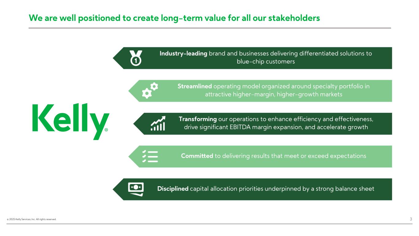 © 2025 Kelly Services, Inc. All rights reserved. Kelly is a leading global specialty talent solutions provider 2 78 years of industry leadership $4.3 billion of revenue in 2024, reflecting organic growth that significantly outperformed the market 3.3% adjusted EBITDA margin in 2024, up 100 basis points over 2023 3 specialized, market-leading business units 400,000 individuals placed in positions with our customers in 2024 #1 Temporary Staffing Company (Forbes, 2024)