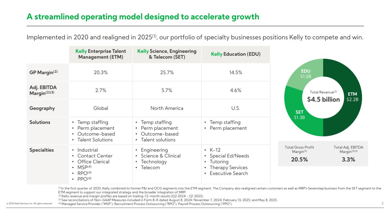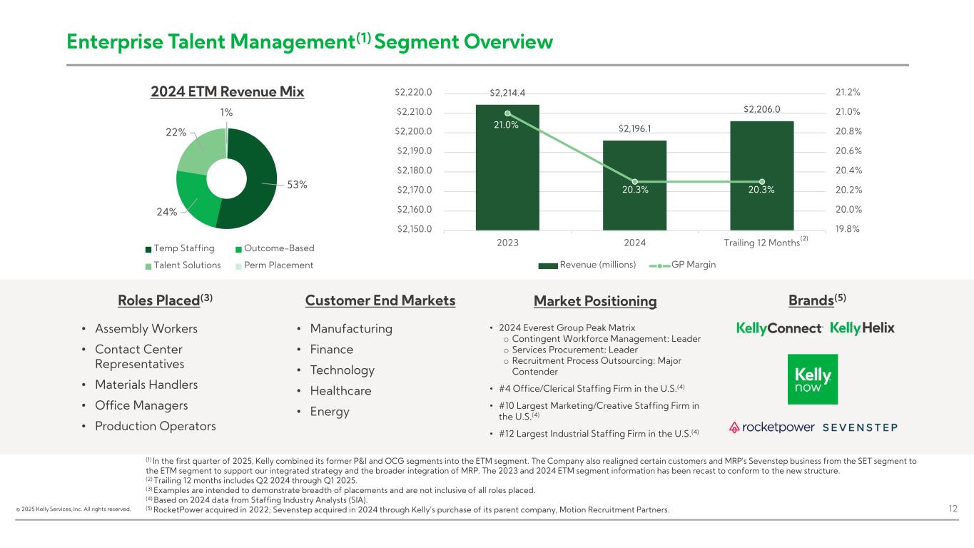 © 2025 Kelly Services, Inc. All rights reserved. $2,214.4 $2,196.1 $2,206.0 21.0% 20.3% 20.3% 19.8% 20.0% 20.2% 20.4% 20.6% 20.8% 21.0% 21.2% $2,150.0 $2,160.0 $2,170.0 $2,180.0 $2,190.0 $2,200.0 $2,210.0 $2,220.0 2023 2024 Trailing 12 Months Revenue (millions) GP Margin Enterprise Talent Management(1) Segment Overview 12 Roles Placed(3) • Assembly Workers • Contact Center Representatives • Materials Handlers • Office Managers • Production Operators Customer End Markets • Manufacturing • Finance • Technology • Healthcare • Energy Market Positioning • 2024 Everest Group Peak Matrix o Contingent Workforce Management: Leader o Services Procurement: Leader o Recruitment Process Outsourcing: Major Contender • #4 Office/Clerical Staffing Firm in the U.S.(4) • #10 Largest Marketing/Creative Staffing Firm in the U.S.(4) • #12 Largest Industrial Staffing Firm in the U.S.(4) Brands(5) (1) In the first quarter of 2025, Kelly combined its former P&I and OCG segments into the ETM segment. The Company also realigned certain customers and MRP's Sevenstep business from the SET segment to the ETM segment to support our integrated strategy and the broader integration of MRP. The 2023 and 2024 ETM segment information has been recast to conform to the new structure. (2) Trailing 12 months includes Q2 2024 through Q1 2025. (3) Examples are intended to demonstrate breadth of placements and are not inclusive of all roles placed. (4) Based on 2024 data from Staffing Industry Analysts (SIA). (5) RocketPower acquired in 2022; Sevenstep acquired in 2024 through Kelly’s purchase of its parent company, Motion Recruitment Partners. 2024 ETM Revenue Mix 53% 24% 22% 1% Temp Staffing Outcome-Based Talent Solutions Perm Placement (2)