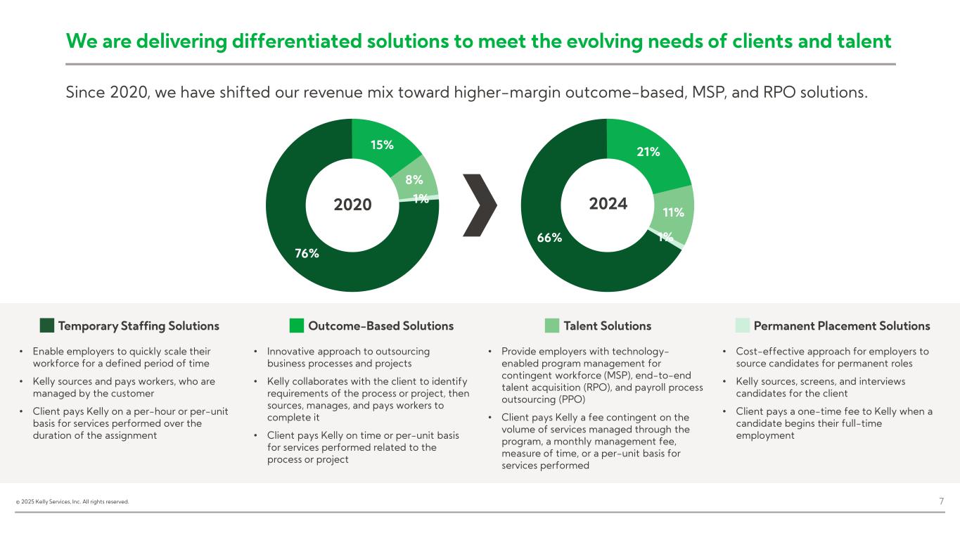 © 2025 Kelly Services, Inc. All rights reserved. We have driven significant progress on our Specialty Growth Journey 6 (1) On January 2, 2024, Kelly completed the sale of its European staffing operations. Following the sale, its Mexico operations, which were previously included in the International segment, is now included in the ETM segment, and the International segment no longer exists as a reportable segment. (2) Kelly combined its former P&I and OCG segments into the ETM segment in the first quarter of 2025. The Company also realigned certain customers as well as MRP's Sevenstep business from the SET segment to the ETM segment to support our integrated strategy and the broader integration of MRP. The 2024 ETM and SET segment information has been recast to conform to the new structure. P&I 40% SET 25% OCG 14% EDU 5% INTL(1) 15% 2020 ETM(2) 50% SET(2) 34% EDU 16% 2024 P&I 41% SET 23% OCG 8% EDU 6% INTL(1) 22% 2020 ETM(2) 51% SET(2) 27% EDU 22% 2024 Launched streamlined operating model in 2020 to sharpen focus on higher-margin, higher-growth specialties Redeployed capital to acquire 7 specialty talent solutions companies, expanding scale and capabilities in SET, Education, and ETM Accelerated organic expansion into Education and higher-margin outcome-based solutions in ETM and SET Enhanced organizational efficiency and effectiveness resulting in structural SG&A savings of more than $100 million Unlocked nearly $500 million by monetizing non- core assets, including a majority of our PersolKelly JV stake and our European staffing operations Revenue Mix Gross Profit Mix