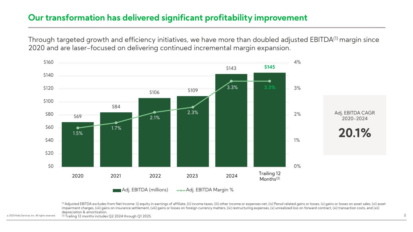 © 2025 Kelly Services, Inc. All rights reserved. We are delivering differentiated solutions to meet the evolving needs of clients and talent 7 76% 15% 8% 1%2020 66% 21% 11% 1% 2024 Temporary Staffing Solutions • Enable employers to quickly scale their workforce for a defined period of time • Kelly sources and pays workers, who are managed by the customer • Client pays Kelly on a per-hour or per-unit basis for services performed over the duration of the assignment Permanent Placement Solutions • Cost-effective approach for employers to source candidates for permanent roles • Kelly sources, screens, and interviews candidates for the client • Client pays a one-time fee to Kelly when a candidate begins their full-time employment Talent Solutions • Provide employers with technology- enabled program management for contingent workforce (MSP), end-to-end talent acquisition (RPO), and payroll process outsourcing (PPO) • Client pays Kelly a fee contingent on the volume of services managed through the program, a monthly management fee, measure of time, or a per-unit basis for services performed Outcome-Based Solutions • Innovative approach to outsourcing business processes and projects • Kelly collaborates with the client to identify requirements of the process or project, then sources, manages, and pays workers to complete it • Client pays Kelly on time or per-unit basis for services performed related to the process or project Since 2020, we have shifted our revenue mix toward higher-margin outcome-based, MSP, and RPO solutions.