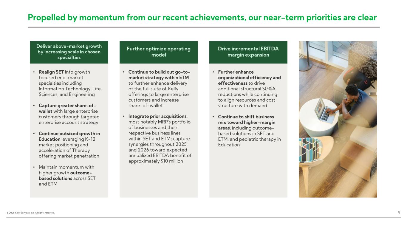 © 2025 Kelly Services, Inc. All rights reserved. (1) Adjusted EBITDA excludes from Net Income: (i) equity in earnings of affiliate, (ii) income taxes, (iii) other income or expenses net, (iv) Persol related gains or losses, (v) gains or losses on asset sales, (vi) asset impairment charges, (vii) gains on insurance settlement, (viii) gains or losses on foreign currency matters, (ix) restructuring expenses, (x) unrealized loss on forward contract, (xi) transaction costs, and (xii) depreciation & amortization. (2) Trailing 12 months includes Q2 2024 through Q1 2025. Our transformation has delivered significant profitability improvement 8 Through targeted growth and efficiency initiatives, we have more than doubled adjusted EBITDA(1) margin since 2020 and are laser-focused on delivering continued incremental margin expansion. Adj. EBITDA CAGR 2020-2024 20.1% $69 $84 $106 $109 $143 $145 1.5% 1.7% 2.1% 2.3% 3.3% 3.3% 0% 1% 2% 3% 4% $0 $20 $40 $60 $80 $100 $120 $140 $160 Adj. EBITDA (millions) Adj. EBITDA Margin % 2020 2021 2022 2023 2024 Trailing 12 Months(2)