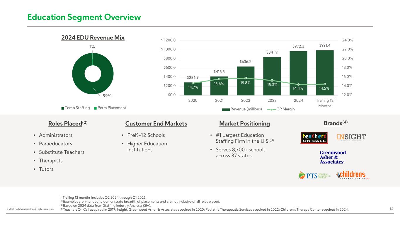 © 2025 Kelly Services, Inc. All rights reserved. $970.6 $1,165.7 $1,256.5 25.4% 25.6% 25.7% 24.0% 24.5% 25.0% 25.5% 26.0% 26.5% 27.0% 27.5% 28.0% $0.0 $200.0 $400.0 $600.0 $800.0 $1,000.0 $1,200.0 $1,400.0 $1,600.0 2023 2024 Trailing 12 Months Revenue (millions) GP Margin Science, Engineering & Technology(1) Segment Overview 13 Roles Placed(2) • Chemists • Data Analysts • Laboratory Technicians • Mechanical Engineers • Regulatory Affairs Specialists Customer End Markets • Medical Devices • Pharmaceuticals • Insurance • Chemicals • Aerospace & Defense 66% 30% 2% 2% Temp Staffing Outcome-Based Perm Placement Talent Solutions Brands(4) 2024 SET Revenue Mix (1) In the first quarter of 2025, Kelly realigned certain customers and MRP's Sevenstep business from the SET segment to the ETM segment to support our integrated strategy and the broader integration of MRP. The 2023 and 2024 SET segment information has been recast to conform to the new structure. (2) Trailing 12 months includes Q2 2024 through Q1 2025. (3) Examples are intended to demonstrate breadth of placements and are not inclusive of all roles placed. (4) Based on 2024 data from Staffing Industry Analysts (SIA). (5) NextGen, GTA acquired in 2019; Softworld acquired in 2021; Motion Recruitment and TG Federal acquired in 2024 through Kelly’s purchase of their parent company, Motion Recruitment Partners. Market Positioning • #2 Largest Life Science Staffing Firm in the U.S.(3) • #4 Largest Engineering Staffing Firm in the U.S.(3) • #10 Largest IT Staffing Firm in the U.S.(3) (2)