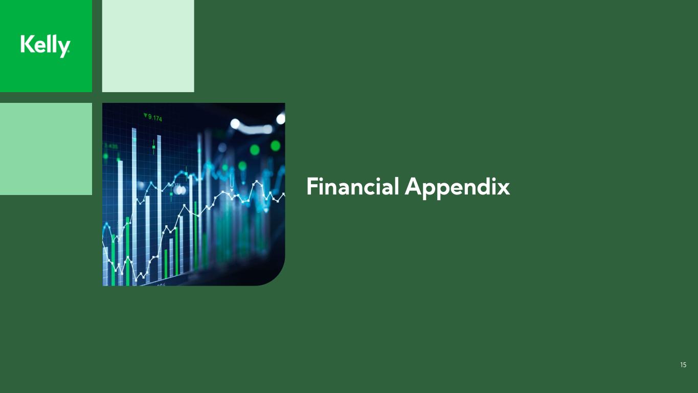 © 2025 Kelly Services, Inc. All rights reserved. $286.9 $416.5 $636.2 $841.9 $972.3 $991.4 14.7% 15.6% 15.8% 15.3% 14.4% 14.5% 12.0% 14.0% 16.0% 18.0% 20.0% 22.0% 24.0% $0.0 $200.0 $400.0 $600.0 $800.0 $1,000.0 $1,200.0 2020 2021 2022 2023 2024 Trailing 12 Months Revenue (millions) GP Margin Education Segment Overview 14 99% 1% Temp Staffing Perm Placement 2024 EDU Revenue Mix (1) Trailing 12 months includes Q2 2024 through Q1 2025. (2) Examples are intended to demonstrate breadth of placements and are not inclusive of all roles placed. (3) Based on 2024 data from Staffing Industry Analysts (SIA). (4) Teachers On Call acquired in 2017; Insight, Greenwood Asher & Associates acquired in 2020; Pediatric Therapeutic Services acquired in 2022; Children’s Therapy Center acquired in 2024. Roles Placed(2) • Administrators • Paraeducators • Substitute Teachers • Therapists • Tutors Customer End Markets • PreK-12 Schools • Higher Education Institutions Market Positioning • #1 Largest Education Staffing Firm in the U.S.(3) • Serves 8,700+ schools across 37 states Brands(4) (1)
