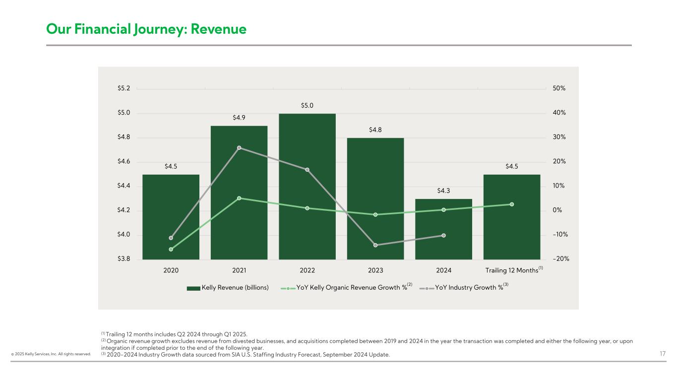 © 2025 Kelly Services, Inc. All rights reserved. Q2 2025 Outlook 16 Our Q2 2025 Outlook assumes macro and staffing market conditions consistent with those at the end of the first quarter. Through our ongoing focus on efficiency and effectiveness, we are well prepared to navigate this rapidly evolving macroeconomic environment and capitalize when demand rebounds Second Quarter 2025: • Revenue – total Company year-over-year revenue growth of 6.0% to 7.0% o Includes inorganic growth from MRP acquisition through the May 31 anniversary date of the transaction. o Organic revenue trends impacted 1.0% to 1.5% from reducing demand for U.S. federal contractors and 1.0% related to slower economic growth relative to our initial expectations. Excluding these impacts, expect roughly flat organic revenue year- over-year • Adjusted EBITDA margin – down 20 to 30 basis points o Similar to first quarter performance o Year-over-year expansion expected in Q3 and Q4, and for the full year, as benefits from efficiency and optimization initiatives phase in