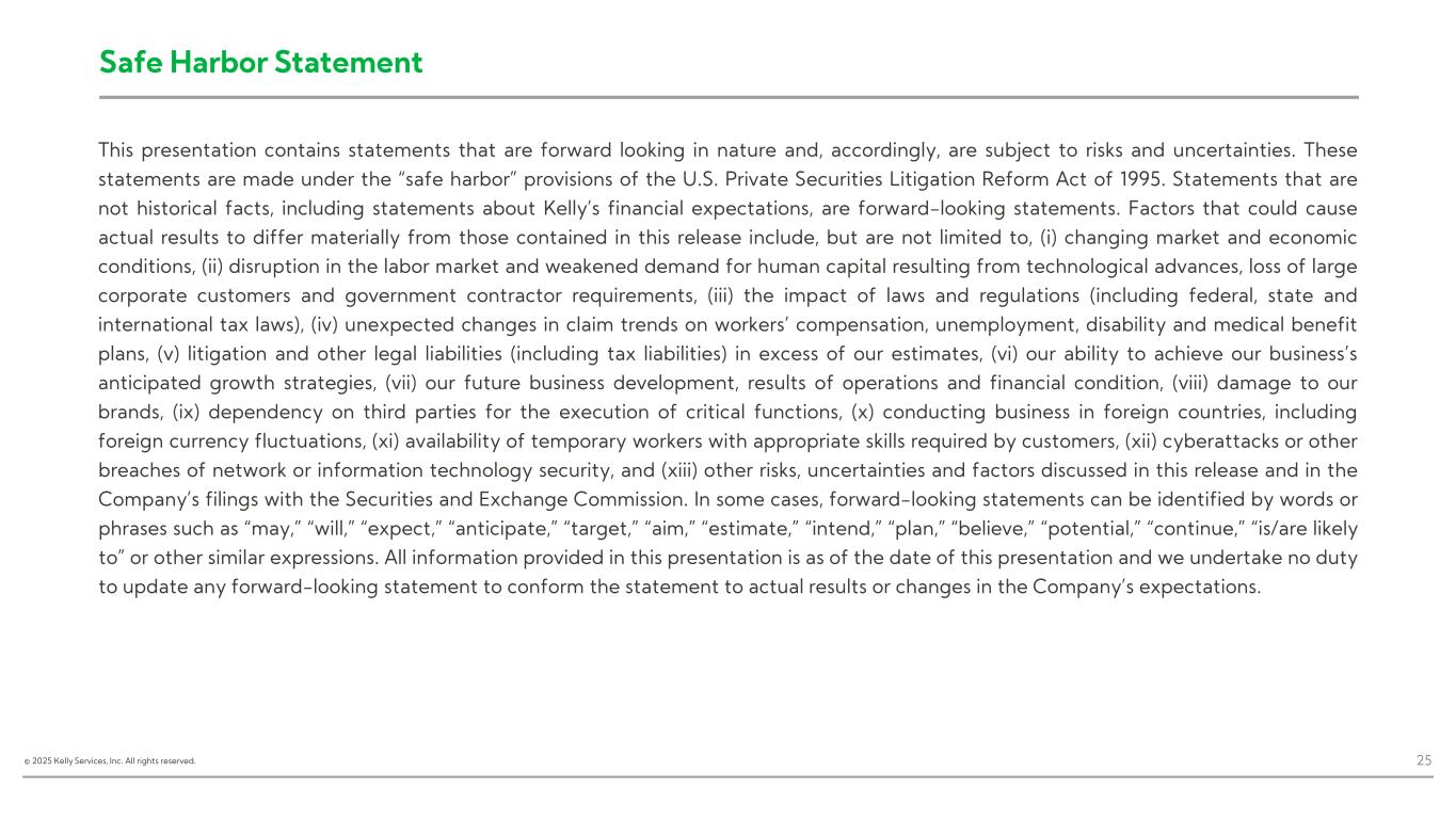 © 2025 Kelly Services, Inc. All rights reserved. Safe Harbor Statement 25 This presentation contains statements that are forward looking in nature and, accordingly, are subject to risks and uncertainties. These statements are made under the “safe harbor” provisions of the U.S. Private Securities Litigation Reform Act of 1995. Statements that are not historical facts, including statements about Kelly’s financial expectations, are forward-looking statements. Factors that could cause actual results to differ materially from those contained in this release include, but are not limited to, (i) changing market and economic conditions, (ii) disruption in the labor market and weakened demand for human capital resulting from technological advances, loss of large corporate customers and government contractor requirements, (iii) the impact of laws and regulations (including federal, state and international tax laws), (iv) unexpected changes in claim trends on workers’ compensation, unemployment, disability and medical benefit plans, (v) litigation and other legal liabilities (including tax liabilities) in excess of our estimates, (vi) our ability to achieve our business’s anticipated growth strategies, (vii) our future business development, results of operations and financial condition, (viii) damage to our brands, (ix) dependency on third parties for the execution of critical functions, (x) conducting business in foreign countries, including foreign currency fluctuations, (xi) availability of temporary workers with appropriate skills required by customers, (xii) cyberattacks or other breaches of network or information technology security, and (xiii) other risks, uncertainties and factors discussed in this release and in the Company’s filings with the Securities and Exchange Commission. In some cases, forward-looking statements can be identified by words or phrases such as “may,” “will,” “expect,” “anticipate,” “target,” “aim,” “estimate,” “intend,” “plan,” “believe,” “potential,” “continue,” “is/are likely to” or other similar expressions. All information provided in this presentation is as of the date of this presentation and we undertake no duty to update any forward-looking statement to conform the statement to actual results or changes in the Company’s expectations.