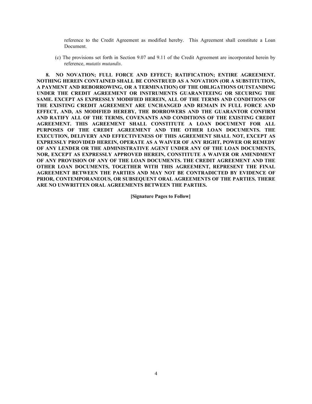 4 reference to the Credit Agreement as modified hereby. This Agreement shall constitute a Loan Document. (c) The provisions set forth in Section 9.07 and 9.11 of the Credit Agreement are incorporated herein by reference, mutatis mutandis. 8. NO NOVATION; FULL FORCE AND EFFECT; RATIFICATION; ENTIRE AGREEMENT. NOTHING HEREIN CONTAINED SHALL BE CONSTRUED AS A NOVATION (OR A SUBSTITUTION, A PAYMENT AND REBORROWING, OR A TERMINATION) OF THE OBLIGATIONS OUTSTANDING UNDER THE CREDIT AGREEMENT OR INSTRUMENTS GUARANTEEING OR SECURING THE SAME. EXCEPT AS EXPRESSLY MODIFIED HEREIN, ALL OF THE TERMS AND CONDITIONS OF THE EXISTING CREDIT AGREEMENT ARE UNCHANGED AND REMAIN IN FULL FORCE AND EFFECT, AND, AS MODIFIED HEREBY, THE BORROWERS AND THE GUARANTOR CONFIRM AND RATIFY ALL OF THE TERMS, COVENANTS AND CONDITIONS OF THE EXISTING CREDIT AGREEMENT. THIS AGREEMENT SHALL CONSTITUTE A LOAN DOCUMENT FOR ALL PURPOSES OF THE CREDIT AGREEMENT AND THE OTHER LOAN DOCUMENTS. THE EXECUTION, DELIVERY AND EFFECTIVENESS OF THIS AGREEMENT SHALL NOT, EXCEPT AS EXPRESSLY PROVIDED HEREIN, OPERATE AS A WAIVER OF ANY RIGHT, POWER OR REMEDY OF ANY LENDER OR THE ADMINISTRATIVE AGENT UNDER ANY OF THE LOAN DOCUMENTS, NOR, EXCEPT AS EXPRESSLY APPROVED HEREIN, CONSTITUTE A WAIVER OR AMENDMENT OF ANY PROVISION OF ANY OF THE LOAN DOCUMENTS. THE CREDIT AGREEMENT AND THE OTHER LOAN DOCUMENTS, TOGETHER WITH THIS AGREEMENT, REPRESENT THE FINAL AGREEMENT BETWEEN THE PARTIES AND MAY NOT BE CONTRADICTED BY EVIDENCE OF PRIOR, CONTEMPORANEOUS, OR SUBSEQUENT ORAL AGREEMENTS OF THE PARTIES. THERE ARE NO UNWRITTEN ORAL AGREEMENTS BETWEEN THE PARTIES. [Signature Pages to Follow]