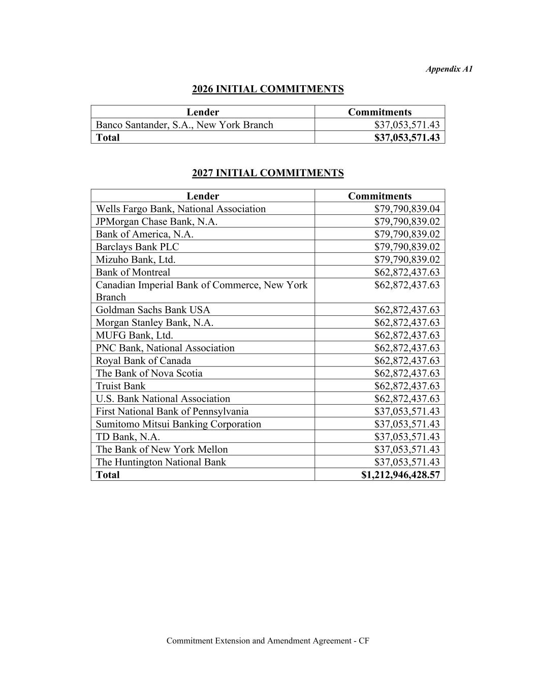 Commitment Extension and Amendment Agreement - CF Appendix A1 2026 INITIAL COMMITMENTS Lender Commitments Banco Santander, S.A., New York Branch $37,053,571.43 Total $37,053,571.43 2027 INITIAL COMMITMENTS Lender Commitments Wells Fargo Bank, National Association $79,790,839.04 JPMorgan Chase Bank, N.A. $79,790,839.02 Bank of America, N.A. $79,790,839.02 Barclays Bank PLC $79,790,839.02 Mizuho Bank, Ltd. $79,790,839.02 Bank of Montreal $62,872,437.63 Canadian Imperial Bank of Commerce, New York Branch $62,872,437.63 Goldman Sachs Bank USA $62,872,437.63 Morgan Stanley Bank, N.A. $62,872,437.63 MUFG Bank, Ltd. $62,872,437.63 PNC Bank, National Association $62,872,437.63 Royal Bank of Canada $62,872,437.63 The Bank of Nova Scotia $62,872,437.63 Truist Bank $62,872,437.63 U.S. Bank National Association $62,872,437.63 First National Bank of Pennsylvania $37,053,571.43 Sumitomo Mitsui Banking Corporation $37,053,571.43 TD Bank, N.A. $37,053,571.43 The Bank of New York Mellon $37,053,571.43 The Huntington National Bank $37,053,571.43 Total $1,212,946,428.57
