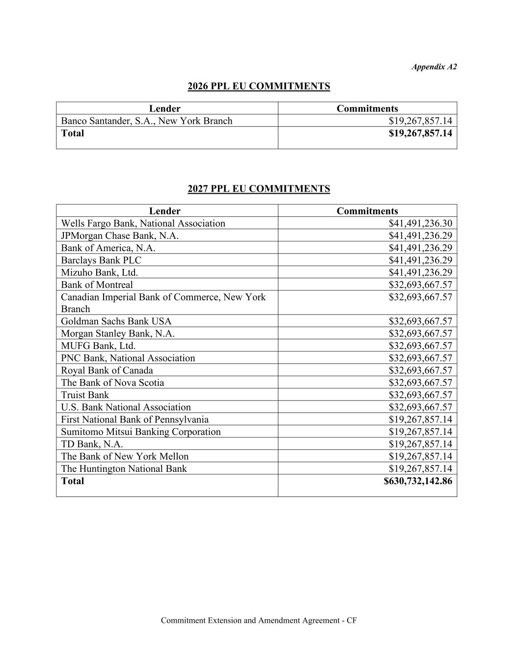 Commitment Extension and Amendment Agreement - CF Appendix A2 2026 PPL EU COMMITMENTS Lender Commitments Banco Santander, S.A., New York Branch $19,267,857.14 Total $19,267,857.14 2027 PPL EU COMMITMENTS Lender Commitments Wells Fargo Bank, National Association $41,491,236.30 JPMorgan Chase Bank, N.A. $41,491,236.29 Bank of America, N.A. $41,491,236.29 Barclays Bank PLC $41,491,236.29 Mizuho Bank, Ltd. $41,491,236.29 Bank of Montreal $32,693,667.57 Canadian Imperial Bank of Commerce, New York Branch $32,693,667.57 Goldman Sachs Bank USA $32,693,667.57 Morgan Stanley Bank, N.A. $32,693,667.57 MUFG Bank, Ltd. $32,693,667.57 PNC Bank, National Association $32,693,667.57 Royal Bank of Canada $32,693,667.57 The Bank of Nova Scotia $32,693,667.57 Truist Bank $32,693,667.57 U.S. Bank National Association $32,693,667.57 First National Bank of Pennsylvania $19,267,857.14 Sumitomo Mitsui Banking Corporation $19,267,857.14 TD Bank, N.A. $19,267,857.14 The Bank of New York Mellon $19,267,857.14 The Huntington National Bank $19,267,857.14 Total $630,732,142.86