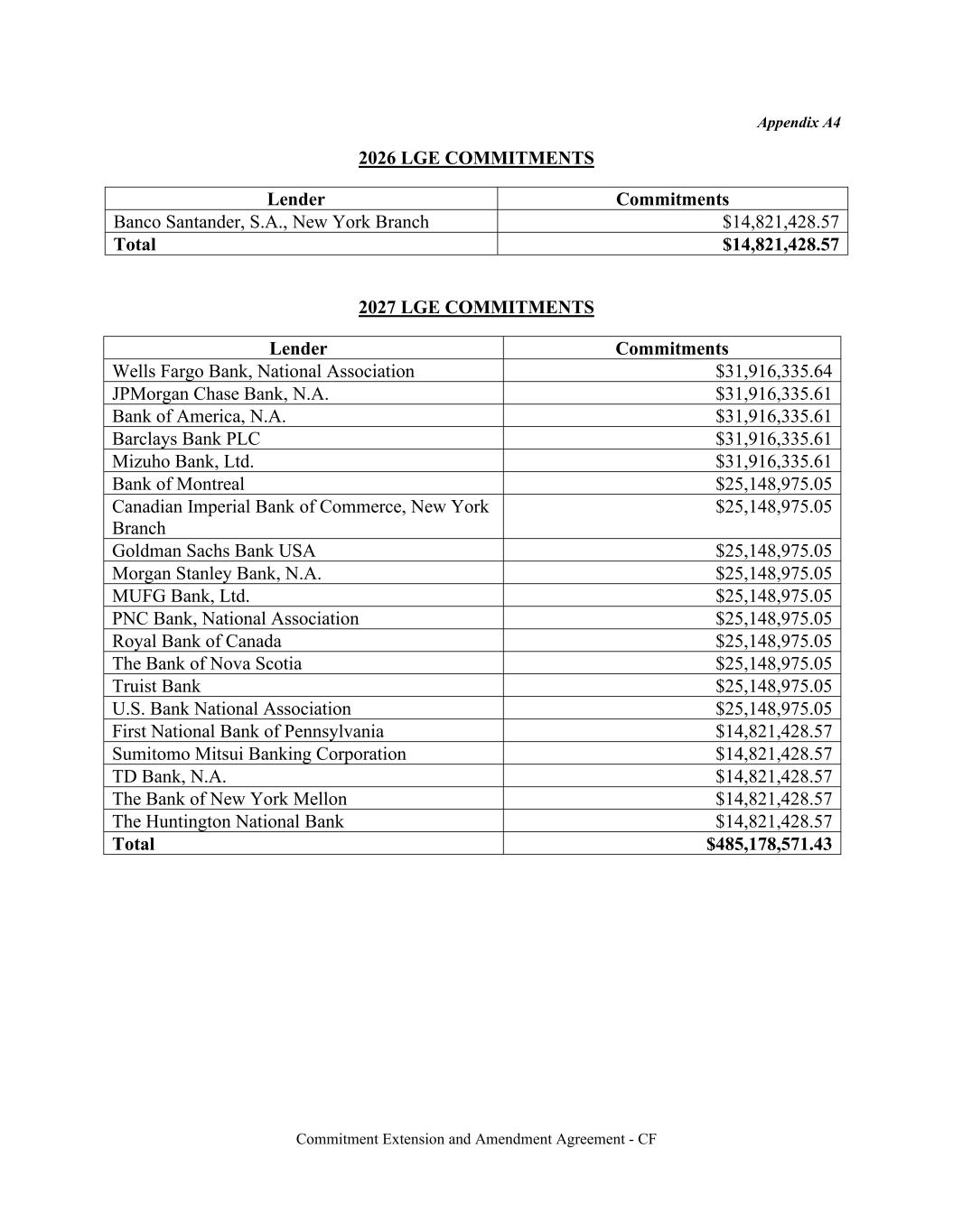 Commitment Extension and Amendment Agreement - CF Appendix A4 2026 LGE COMMITMENTS Lender Commitments Banco Santander, S.A., New York Branch $14,821,428.57 Total $14,821,428.57 2027 LGE COMMITMENTS Lender Commitments Wells Fargo Bank, National Association $31,916,335.64 JPMorgan Chase Bank, N.A. $31,916,335.61 Bank of America, N.A. $31,916,335.61 Barclays Bank PLC $31,916,335.61 Mizuho Bank, Ltd. $31,916,335.61 Bank of Montreal $25,148,975.05 Canadian Imperial Bank of Commerce, New York Branch $25,148,975.05 Goldman Sachs Bank USA $25,148,975.05 Morgan Stanley Bank, N.A. $25,148,975.05 MUFG Bank, Ltd. $25,148,975.05 PNC Bank, National Association $25,148,975.05 Royal Bank of Canada $25,148,975.05 The Bank of Nova Scotia $25,148,975.05 Truist Bank $25,148,975.05 U.S. Bank National Association $25,148,975.05 First National Bank of Pennsylvania $14,821,428.57 Sumitomo Mitsui Banking Corporation $14,821,428.57 TD Bank, N.A. $14,821,428.57 The Bank of New York Mellon $14,821,428.57 The Huntington National Bank $14,821,428.57 Total $485,178,571.43