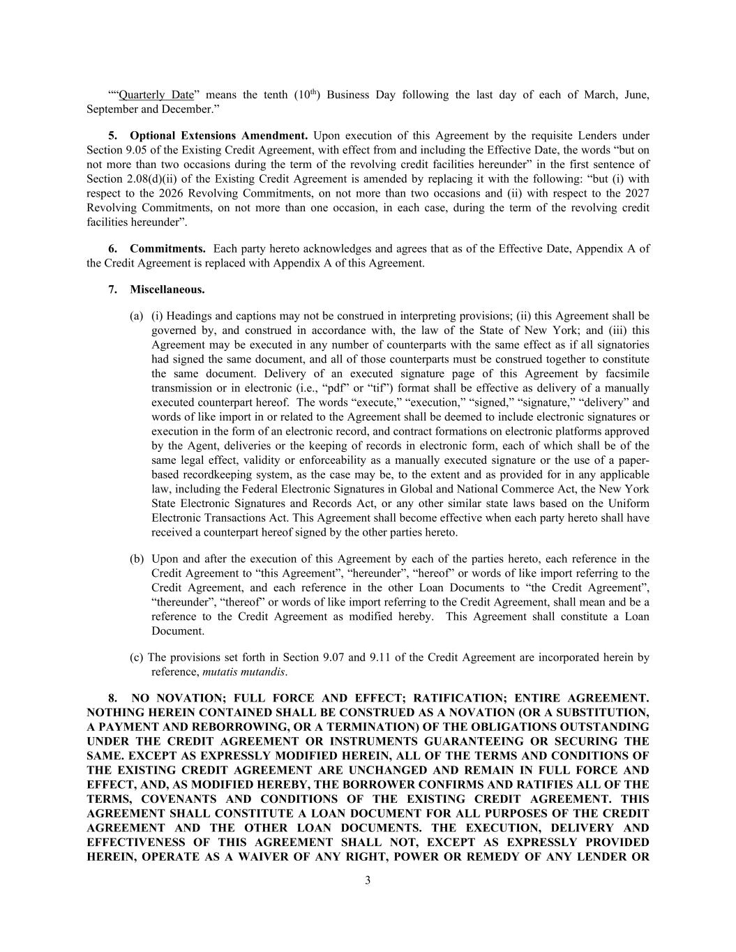 3 ““Quarterly Date” means the tenth (10th) Business Day following the last day of each of March, June, September and December.” 5. Optional Extensions Amendment. Upon execution of this Agreement by the requisite Lenders under Section 9.05 of the Existing Credit Agreement, with effect from and including the Effective Date, the words “but on not more than two occasions during the term of the revolving credit facilities hereunder” in the first sentence of Section 2.08(d)(ii) of the Existing Credit Agreement is amended by replacing it with the following: “but (i) with respect to the 2026 Revolving Commitments, on not more than two occasions and (ii) with respect to the 2027 Revolving Commitments, on not more than one occasion, in each case, during the term of the revolving credit facilities hereunder”. 6. Commitments. Each party hereto acknowledges and agrees that as of the Effective Date, Appendix A of the Credit Agreement is replaced with Appendix A of this Agreement. 7. Miscellaneous. (a) (i) Headings and captions may not be construed in interpreting provisions; (ii) this Agreement shall be governed by, and construed in accordance with, the law of the State of New York; and (iii) this Agreement may be executed in any number of counterparts with the same effect as if all signatories had signed the same document, and all of those counterparts must be construed together to constitute the same document. Delivery of an executed signature page of this Agreement by facsimile transmission or in electronic (i.e., “pdf” or “tif”) format shall be effective as delivery of a manually executed counterpart hereof. The words “execute,” “execution,” “signed,” “signature,” “delivery” and words of like import in or related to the Agreement shall be deemed to include electronic signatures or execution in the form of an electronic record, and contract formations on electronic platforms approved by the Agent, deliveries or the keeping of records in electronic form, each of which shall be of the same legal effect, validity or enforceability as a manually executed signature or the use of a paper- based recordkeeping system, as the case may be, to the extent and as provided for in any applicable law, including the Federal Electronic Signatures in Global and National Commerce Act, the New York State Electronic Signatures and Records Act, or any other similar state laws based on the Uniform Electronic Transactions Act. This Agreement shall become effective when each party hereto shall have received a counterpart hereof signed by the other parties hereto. (b) Upon and after the execution of this Agreement by each of the parties hereto, each reference in the Credit Agreement to “this Agreement”, “hereunder”, “hereof” or words of like import referring to the Credit Agreement, and each reference in the other Loan Documents to “the Credit Agreement”, “thereunder”, “thereof” or words of like import referring to the Credit Agreement, shall mean and be a reference to the Credit Agreement as modified hereby. This Agreement shall constitute a Loan Document. (c) The provisions set forth in Section 9.07 and 9.11 of the Credit Agreement are incorporated herein by reference, mutatis mutandis. 8. NO NOVATION; FULL FORCE AND EFFECT; RATIFICATION; ENTIRE AGREEMENT. NOTHING HEREIN CONTAINED SHALL BE CONSTRUED AS A NOVATION (OR A SUBSTITUTION, A PAYMENT AND REBORROWING, OR A TERMINATION) OF THE OBLIGATIONS OUTSTANDING UNDER THE CREDIT AGREEMENT OR INSTRUMENTS GUARANTEEING OR SECURING THE SAME. EXCEPT AS EXPRESSLY MODIFIED HEREIN, ALL OF THE TERMS AND CONDITIONS OF THE EXISTING CREDIT AGREEMENT ARE UNCHANGED AND REMAIN IN FULL FORCE AND EFFECT, AND, AS MODIFIED HEREBY, THE BORROWER CONFIRMS AND RATIFIES ALL OF THE TERMS, COVENANTS AND CONDITIONS OF THE EXISTING CREDIT AGREEMENT. THIS AGREEMENT SHALL CONSTITUTE A LOAN DOCUMENT FOR ALL PURPOSES OF THE CREDIT AGREEMENT AND THE OTHER LOAN DOCUMENTS. THE EXECUTION, DELIVERY AND EFFECTIVENESS OF THIS AGREEMENT SHALL NOT, EXCEPT AS EXPRESSLY PROVIDED HEREIN, OPERATE AS A WAIVER OF ANY RIGHT, POWER OR REMEDY OF ANY LENDER OR