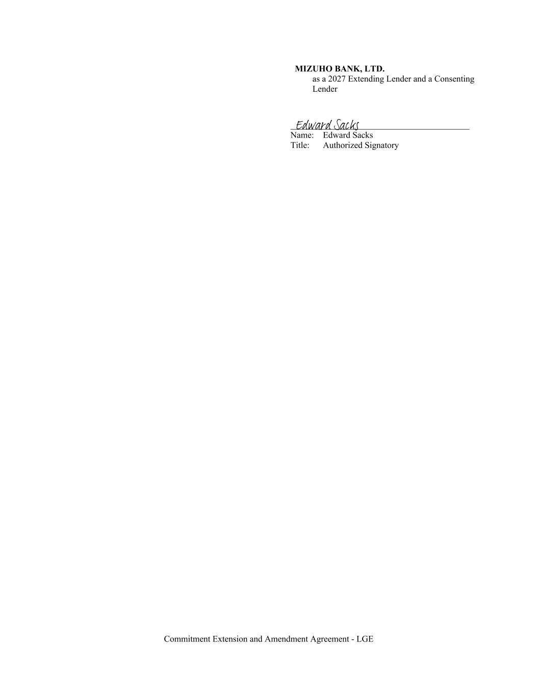 MIZUHO BANK, LTD. as a 2027 Extending Lender and a Consenting Lender Name: Edward Sacks Title: Authorized Signatory Commitment Extension and Amendment Agreement - LGE