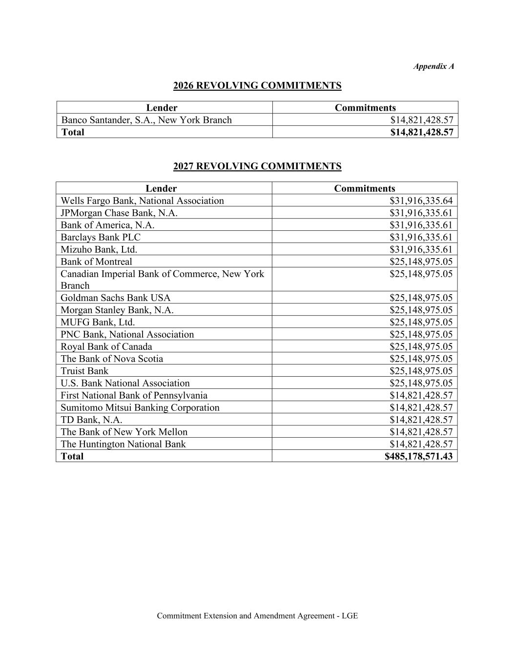 Commitment Extension and Amendment Agreement - LGE Appendix A 2026 REVOLVING COMMITMENTS Lender Commitments Banco Santander, S.A., New York Branch $14,821,428.57 Total $14,821,428.57 2027 REVOLVING COMMITMENTS Lender Commitments Wells Fargo Bank, National Association $31,916,335.64 JPMorgan Chase Bank, N.A. $31,916,335.61 Bank of America, N.A. $31,916,335.61 Barclays Bank PLC $31,916,335.61 Mizuho Bank, Ltd. $31,916,335.61 Bank of Montreal $25,148,975.05 Canadian Imperial Bank of Commerce, New York Branch $25,148,975.05 Goldman Sachs Bank USA $25,148,975.05 Morgan Stanley Bank, N.A. $25,148,975.05 MUFG Bank, Ltd. $25,148,975.05 PNC Bank, National Association $25,148,975.05 Royal Bank of Canada $25,148,975.05 The Bank of Nova Scotia $25,148,975.05 Truist Bank $25,148,975.05 U.S. Bank National Association $25,148,975.05 First National Bank of Pennsylvania $14,821,428.57 Sumitomo Mitsui Banking Corporation $14,821,428.57 TD Bank, N.A. $14,821,428.57 The Bank of New York Mellon $14,821,428.57 The Huntington National Bank $14,821,428.57 Total $485,178,571.43