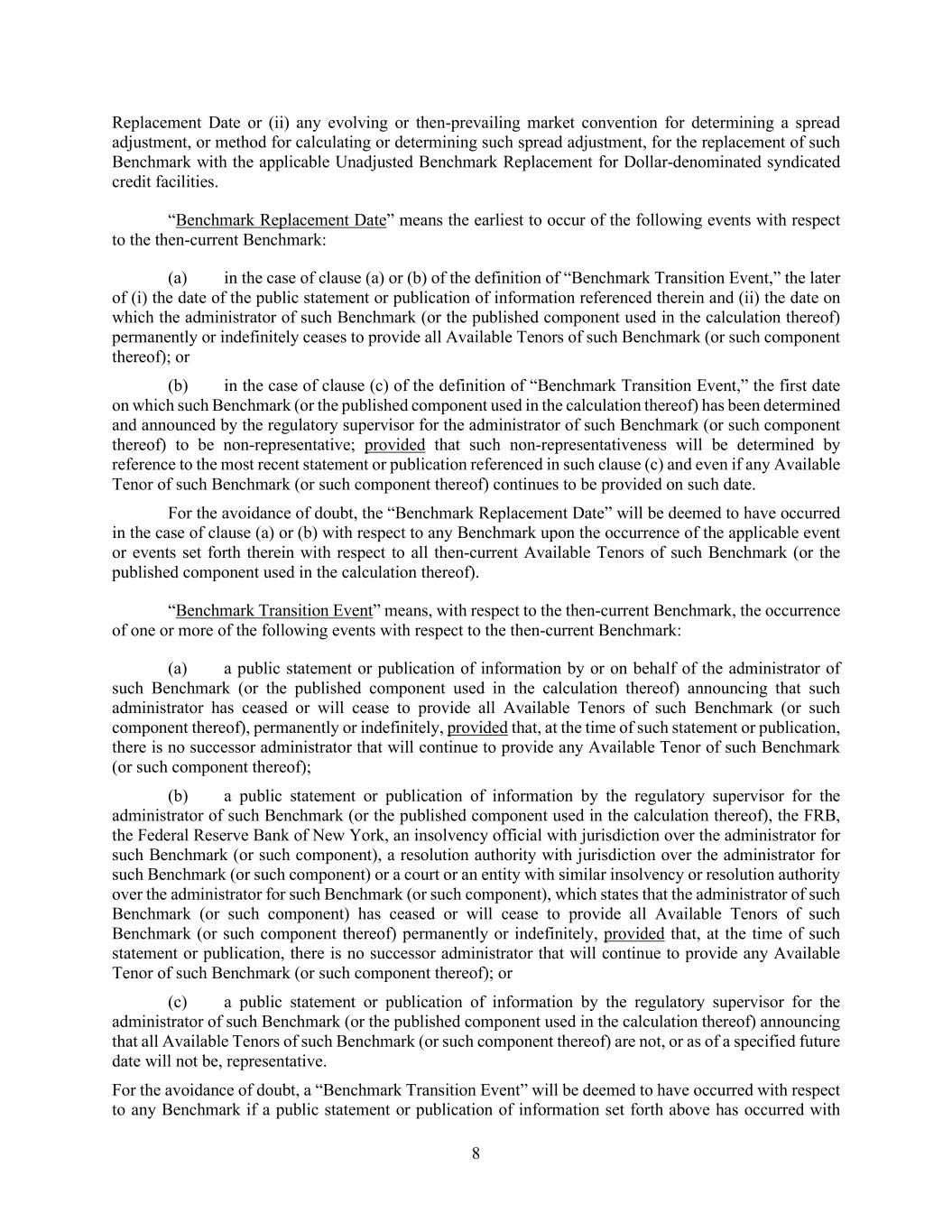 8 Replacement Date or (ii) any evolving or then-prevailing market convention for determining a spread adjustment, or method for calculating or determining such spread adjustment, for the replacement of such Benchmark with the applicable Unadjusted Benchmark Replacement for Dollar-denominated syndicated credit facilities. “Benchmark Replacement Date” means the earliest to occur of the following events with respect to the then-current Benchmark: (a) in the case of clause (a) or (b) of the definition of “Benchmark Transition Event,” the later of (i) the date of the public statement or publication of information referenced therein and (ii) the date on which the administrator of such Benchmark (or the published component used in the calculation thereof) permanently or indefinitely ceases to provide all Available Tenors of such Benchmark (or such component thereof); or (b) in the case of clause (c) of the definition of “Benchmark Transition Event,” the first date on which such Benchmark (or the published component used in the calculation thereof) has been determined and announced by the regulatory supervisor for the administrator of such Benchmark (or such component thereof) to be non-representative; provided that such non-representativeness will be determined by reference to the most recent statement or publication referenced in such clause (c) and even if any Available Tenor of such Benchmark (or such component thereof) continues to be provided on such date. For the avoidance of doubt, the “Benchmark Replacement Date” will be deemed to have occurred in the case of clause (a) or (b) with respect to any Benchmark upon the occurrence of the applicable event or events set forth therein with respect to all then-current Available Tenors of such Benchmark (or the published component used in the calculation thereof). “Benchmark Transition Event” means, with respect to the then-current Benchmark, the occurrence of one or more of the following events with respect to the then-current Benchmark: (a) a public statement or publication of information by or on behalf of the administrator of such Benchmark (or the published component used in the calculation thereof) announcing that such administrator has ceased or will cease to provide all Available Tenors of such Benchmark (or such component thereof), permanently or indefinitely, provided that, at the time of such statement or publication, there is no successor administrator that will continue to provide any Available Tenor of such Benchmark (or such component thereof); (b) a public statement or publication of information by the regulatory supervisor for the administrator of such Benchmark (or the published component used in the calculation thereof), the FRB, the Federal Reserve Bank of New York, an insolvency official with jurisdiction over the administrator for such Benchmark (or such component), a resolution authority with jurisdiction over the administrator for such Benchmark (or such component) or a court or an entity with similar insolvency or resolution authority over the administrator for such Benchmark (or such component), which states that the administrator of such Benchmark (or such component) has ceased or will cease to provide all Available Tenors of such Benchmark (or such component thereof) permanently or indefinitely, provided that, at the time of such statement or publication, there is no successor administrator that will continue to provide any Available Tenor of such Benchmark (or such component thereof); or (c) a public statement or publication of information by the regulatory supervisor for the administrator of such Benchmark (or the published component used in the calculation thereof) announcing that all Available Tenors of such Benchmark (or such component thereof) are not, or as of a specified future date will not be, representative. For the avoidance of doubt, a “Benchmark Transition Event” will be deemed to have occurred with respect to any Benchmark if a public statement or publication of information set forth above has occurred with