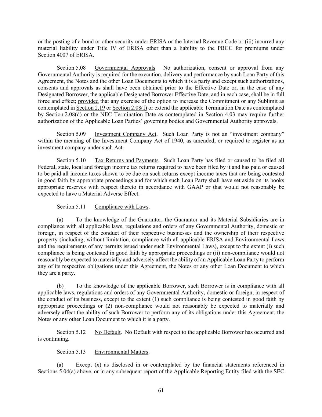 61 or the posting of a bond or other security under ERISA or the Internal Revenue Code or (iii) incurred any material liability under Title IV of ERISA other than a liability to the PBGC for premiums under Section 4007 of ERISA. Section 5.08 Governmental Approvals. No authorization, consent or approval from any Governmental Authority is required for the execution, delivery and performance by such Loan Party of this Agreement, the Notes and the other Loan Documents to which it is a party and except such authorizations, consents and approvals as shall have been obtained prior to the Effective Date or, in the case of any Designated Borrower, the applicable Designated Borrower Effective Date, and in each case, shall be in full force and effect; provided that any exercise of the option to increase the Commitment or any Sublimit as contemplated in Section 2.19 or Section 2.08(f) or extend the applicable Termination Date as contemplated by Section 2.08(d) or the NEC Termination Date as contemplated in Section 4.03 may require further authorization of the Applicable Loan Parties’ governing bodies and Governmental Authority approvals. Section 5.09 Investment Company Act. Such Loan Party is not an “investment company” within the meaning of the Investment Company Act of 1940, as amended, or required to register as an investment company under such Act. Section 5.10 Tax Returns and Payments. Such Loan Party has filed or caused to be filed all Federal, state, local and foreign income tax returns required to have been filed by it and has paid or caused to be paid all income taxes shown to be due on such returns except income taxes that are being contested in good faith by appropriate proceedings and for which such Loan Party shall have set aside on its books appropriate reserves with respect thereto in accordance with GAAP or that would not reasonably be expected to have a Material Adverse Effect. Section 5.11 Compliance with Laws. (a) To the knowledge of the Guarantor, the Guarantor and its Material Subsidiaries are in compliance with all applicable laws, regulations and orders of any Governmental Authority, domestic or foreign, in respect of the conduct of their respective businesses and the ownership of their respective property (including, without limitation, compliance with all applicable ERISA and Environmental Laws and the requirements of any permits issued under such Environmental Laws), except to the extent (i) such compliance is being contested in good faith by appropriate proceedings or (ii) non-compliance would not reasonably be expected to materially and adversely affect the ability of an Applicable Loan Party to perform any of its respective obligations under this Agreement, the Notes or any other Loan Document to which they are a party. (b) To the knowledge of the applicable Borrower, such Borrower is in compliance with all applicable laws, regulations and orders of any Governmental Authority, domestic or foreign, in respect of the conduct of its business, except to the extent (1) such compliance is being contested in good faith by appropriate proceedings or (2) non-compliance would not reasonably be expected to materially and adversely affect the ability of such Borrower to perform any of its obligations under this Agreement, the Notes or any other Loan Document to which it is a party. Section 5.12 No Default. No Default with respect to the applicable Borrower has occurred and is continuing. Section 5.13 Environmental Matters. (a) Except (x) as disclosed in or contemplated by the financial statements referenced in Sections 5.04(a) above, or in any subsequent report of the Applicable Reporting Entity filed with the SEC