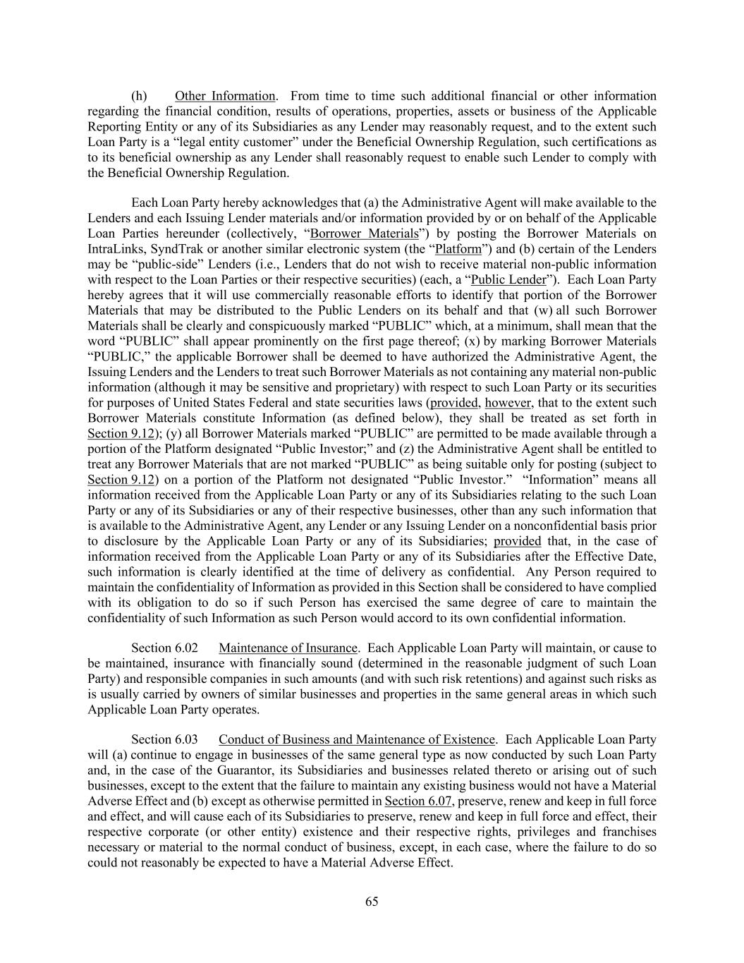 65 (h) Other Information. From time to time such additional financial or other information regarding the financial condition, results of operations, properties, assets or business of the Applicable Reporting Entity or any of its Subsidiaries as any Lender may reasonably request, and to the extent such Loan Party is a “legal entity customer” under the Beneficial Ownership Regulation, such certifications as to its beneficial ownership as any Lender shall reasonably request to enable such Lender to comply with the Beneficial Ownership Regulation. Each Loan Party hereby acknowledges that (a) the Administrative Agent will make available to the Lenders and each Issuing Lender materials and/or information provided by or on behalf of the Applicable Loan Parties hereunder (collectively, “Borrower Materials”) by posting the Borrower Materials on IntraLinks, SyndTrak or another similar electronic system (the “Platform”) and (b) certain of the Lenders may be “public-side” Lenders (i.e., Lenders that do not wish to receive material non-public information with respect to the Loan Parties or their respective securities) (each, a “Public Lender”). Each Loan Party hereby agrees that it will use commercially reasonable efforts to identify that portion of the Borrower Materials that may be distributed to the Public Lenders on its behalf and that (w) all such Borrower Materials shall be clearly and conspicuously marked “PUBLIC” which, at a minimum, shall mean that the word “PUBLIC” shall appear prominently on the first page thereof; (x) by marking Borrower Materials “PUBLIC,” the applicable Borrower shall be deemed to have authorized the Administrative Agent, the Issuing Lenders and the Lenders to treat such Borrower Materials as not containing any material non-public information (although it may be sensitive and proprietary) with respect to such Loan Party or its securities for purposes of United States Federal and state securities laws (provided, however, that to the extent such Borrower Materials constitute Information (as defined below), they shall be treated as set forth in Section 9.12); (y) all Borrower Materials marked “PUBLIC” are permitted to be made available through a portion of the Platform designated “Public Investor;” and (z) the Administrative Agent shall be entitled to treat any Borrower Materials that are not marked “PUBLIC” as being suitable only for posting (subject to Section 9.12) on a portion of the Platform not designated “Public Investor.” “Information” means all information received from the Applicable Loan Party or any of its Subsidiaries relating to the such Loan Party or any of its Subsidiaries or any of their respective businesses, other than any such information that is available to the Administrative Agent, any Lender or any Issuing Lender on a nonconfidential basis prior to disclosure by the Applicable Loan Party or any of its Subsidiaries; provided that, in the case of information received from the Applicable Loan Party or any of its Subsidiaries after the Effective Date, such information is clearly identified at the time of delivery as confidential. Any Person required to maintain the confidentiality of Information as provided in this Section shall be considered to have complied with its obligation to do so if such Person has exercised the same degree of care to maintain the confidentiality of such Information as such Person would accord to its own confidential information. Section 6.02 Maintenance of Insurance. Each Applicable Loan Party will maintain, or cause to be maintained, insurance with financially sound (determined in the reasonable judgment of such Loan Party) and responsible companies in such amounts (and with such risk retentions) and against such risks as is usually carried by owners of similar businesses and properties in the same general areas in which such Applicable Loan Party operates. Section 6.03 Conduct of Business and Maintenance of Existence. Each Applicable Loan Party will (a) continue to engage in businesses of the same general type as now conducted by such Loan Party and, in the case of the Guarantor, its Subsidiaries and businesses related thereto or arising out of such businesses, except to the extent that the failure to maintain any existing business would not have a Material Adverse Effect and (b) except as otherwise permitted in Section 6.07, preserve, renew and keep in full force and effect, and will cause each of its Subsidiaries to preserve, renew and keep in full force and effect, their respective corporate (or other entity) existence and their respective rights, privileges and franchises necessary or material to the normal conduct of business, except, in each case, where the failure to do so could not reasonably be expected to have a Material Adverse Effect.