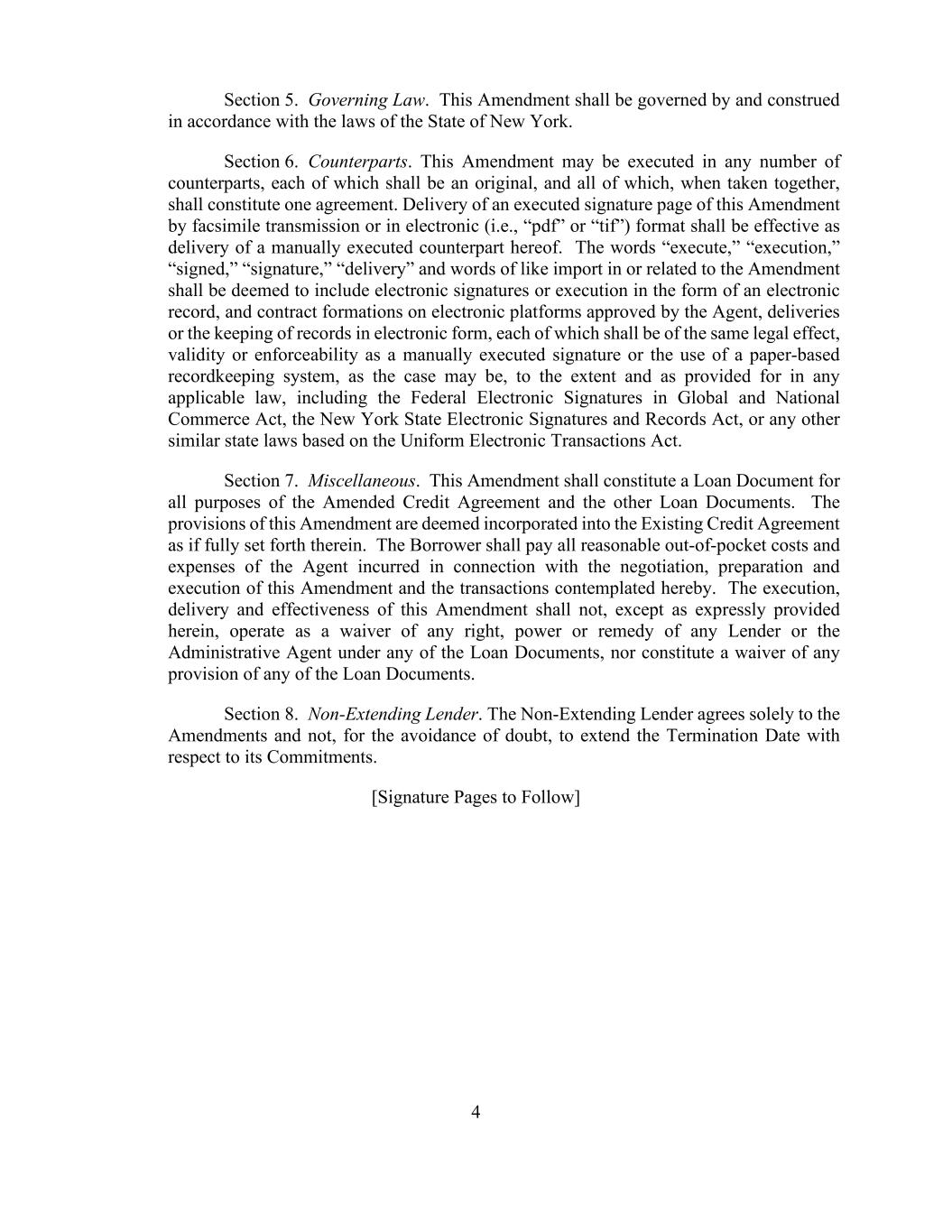 4 Section 5. Governing Law. This Amendment shall be governed by and construed in accordance with the laws of the State of New York. Section 6. Counterparts. This Amendment may be executed in any number of counterparts, each of which shall be an original, and all of which, when taken together, shall constitute one agreement. Delivery of an executed signature page of this Amendment by facsimile transmission or in electronic (i.e., “pdf” or “tif”) format shall be effective as delivery of a manually executed counterpart hereof. The words “execute,” “execution,” “signed,” “signature,” “delivery” and words of like import in or related to the Amendment shall be deemed to include electronic signatures or execution in the form of an electronic record, and contract formations on electronic platforms approved by the Agent, deliveries or the keeping of records in electronic form, each of which shall be of the same legal effect, validity or enforceability as a manually executed signature or the use of a paper-based recordkeeping system, as the case may be, to the extent and as provided for in any applicable law, including the Federal Electronic Signatures in Global and National Commerce Act, the New York State Electronic Signatures and Records Act, or any other similar state laws based on the Uniform Electronic Transactions Act. Section 7. Miscellaneous. This Amendment shall constitute a Loan Document for all purposes of the Amended Credit Agreement and the other Loan Documents. The provisions of this Amendment are deemed incorporated into the Existing Credit Agreement as if fully set forth therein. The Borrower shall pay all reasonable out-of-pocket costs and expenses of the Agent incurred in connection with the negotiation, preparation and execution of this Amendment and the transactions contemplated hereby. The execution, delivery and effectiveness of this Amendment shall not, except as expressly provided herein, operate as a waiver of any right, power or remedy of any Lender or the Administrative Agent under any of the Loan Documents, nor constitute a waiver of any provision of any of the Loan Documents. Section 8. Non-Extending Lender. The Non-Extending Lender agrees solely to the Amendments and not, for the avoidance of doubt, to extend the Termination Date with respect to its Commitments. [Signature Pages to Follow]