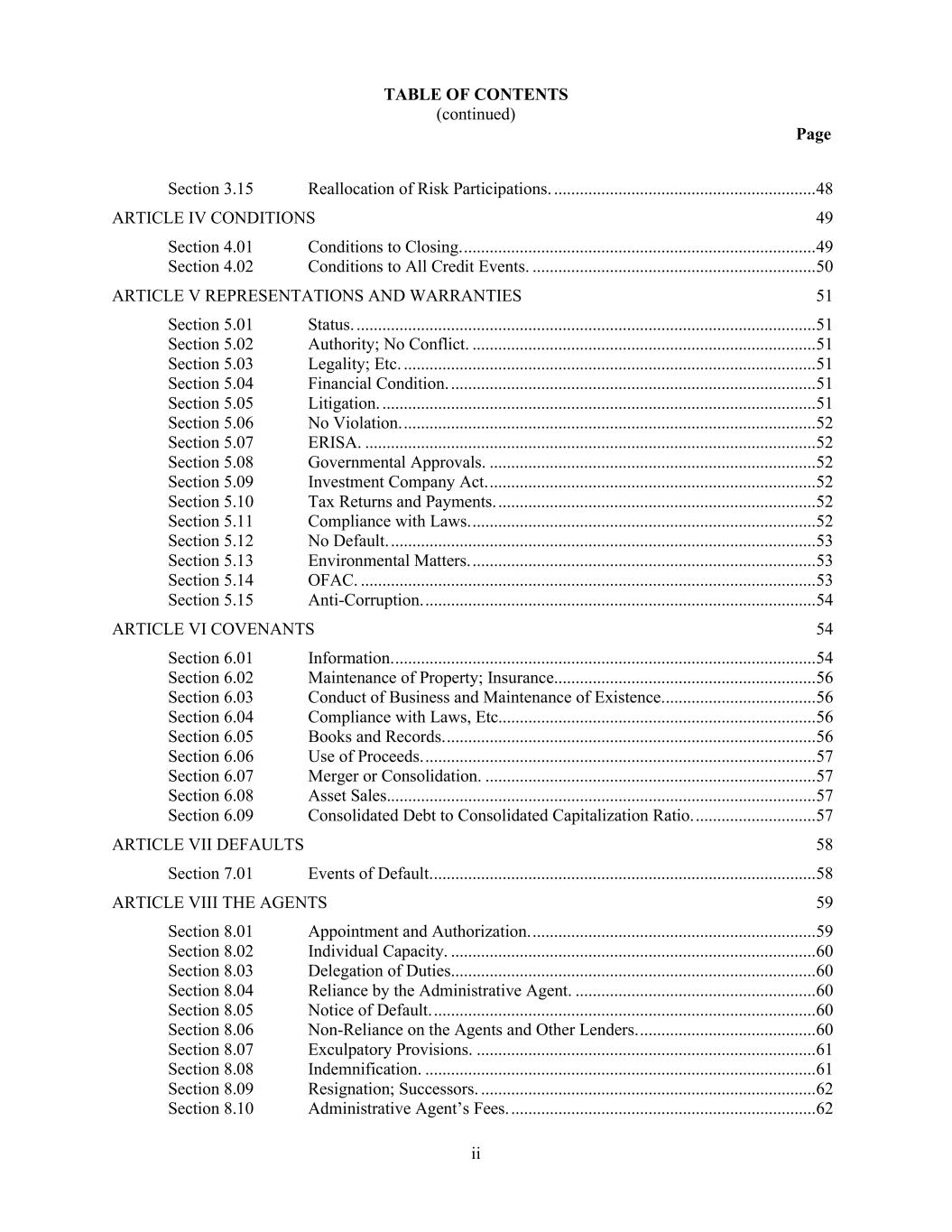 TABLE OF CONTENTS (continued) Page ii Section 3.15 Reallocation of Risk Participations. ............................................................. 48 ARTICLE IV CONDITIONS 49 Section 4.01 Conditions to Closing. .................................................................................. 49 Section 4.02 Conditions to All Credit Events. .................................................................. 50 ARTICLE V REPRESENTATIONS AND WARRANTIES 51 Section 5.01 Status. ........................................................................................................... 51 Section 5.02 Authority; No Conflict. ................................................................................ 51 Section 5.03 Legality; Etc. ................................................................................................ 51 Section 5.04 Financial Condition. ..................................................................................... 51 Section 5.05 Litigation. ..................................................................................................... 51 Section 5.06 No Violation. ................................................................................................ 52 Section 5.07 ERISA. ......................................................................................................... 52 Section 5.08 Governmental Approvals. ............................................................................ 52 Section 5.09 Investment Company Act. ............................................................................ 52 Section 5.10 Tax Returns and Payments. .......................................................................... 52 Section 5.11 Compliance with Laws. ................................................................................ 52 Section 5.12 No Default. ................................................................................................... 53 Section 5.13 Environmental Matters. ................................................................................ 53 Section 5.14 OFAC. .......................................................................................................... 53 Section 5.15 Anti-Corruption. ........................................................................................... 54 ARTICLE VI COVENANTS 54 Section 6.01 Information. .................................................................................................. 54 Section 6.02 Maintenance of Property; Insurance. ............................................................ 56 Section 6.03 Conduct of Business and Maintenance of Existence. ................................... 56 Section 6.04 Compliance with Laws, Etc.......................................................................... 56 Section 6.05 Books and Records. ...................................................................................... 56 Section 6.06 Use of Proceeds. ........................................................................................... 57 Section 6.07 Merger or Consolidation. ............................................................................. 57 Section 6.08 Asset Sales.................................................................................................... 57 Section 6.09 Consolidated Debt to Consolidated Capitalization Ratio. ............................ 57 ARTICLE VII DEFAULTS 58 Section 7.01 Events of Default. ......................................................................................... 58 ARTICLE VIII THE AGENTS 59 Section 8.01 Appointment and Authorization. .................................................................. 59 Section 8.02 Individual Capacity. ..................................................................................... 60 Section 8.03 Delegation of Duties. .................................................................................... 60 Section 8.04 Reliance by the Administrative Agent. ........................................................ 60 Section 8.05 Notice of Default. ......................................................................................... 60 Section 8.06 Non-Reliance on the Agents and Other Lenders. ......................................... 60 Section 8.07 Exculpatory Provisions. ............................................................................... 61 Section 8.08 Indemnification. ........................................................................................... 61 Section 8.09 Resignation; Successors. .............................................................................. 62 Section 8.10 Administrative Agent’s Fees. ....................................................................... 62