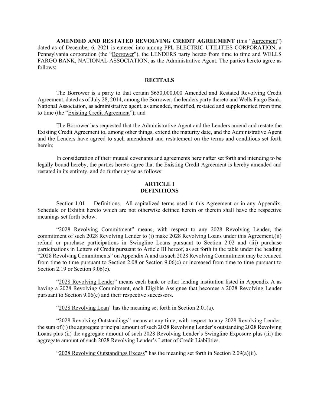 AMENDED AND RESTATED REVOLVING CREDIT AGREEMENT (this “Agreement”) dated as of December 6, 2021 is entered into among PPL ELECTRIC UTILITIES CORPORATION, a Pennsylvania corporation (the “Borrower”), the LENDERS party hereto from time to time and WELLS FARGO BANK, NATIONAL ASSOCIATION, as the Administrative Agent. The parties hereto agree as follows: RECITALS The Borrower is a party to that certain $650,000,000 Amended and Restated Revolving Credit Agreement, dated as of July 28, 2014, among the Borrower, the lenders party thereto and Wells Fargo Bank, National Association, as administrative agent, as amended, modified, restated and supplemented from time to time (the “Existing Credit Agreement”); and The Borrower has requested that the Administrative Agent and the Lenders amend and restate the Existing Credit Agreement to, among other things, extend the maturity date, and the Administrative Agent and the Lenders have agreed to such amendment and restatement on the terms and conditions set forth herein; In consideration of their mutual covenants and agreements hereinafter set forth and intending to be legally bound hereby, the parties hereto agree that the Existing Credit Agreement is hereby amended and restated in its entirety, and do further agree as follows: ARTICLE I DEFINITIONS Section 1.01 Definitions. All capitalized terms used in this Agreement or in any Appendix, Schedule or Exhibit hereto which are not otherwise defined herein or therein shall have the respective meanings set forth below. “2028 Revolving Commitment” means, with respect to any 2028 Revolving Lender, the commitment of such 2028 Revolving Lender to (i) make 2028 Revolving Loans under this Agreement,(ii) refund or purchase participations in Swingline Loans pursuant to Section 2.02 and (iii) purchase participations in Letters of Credit pursuant to Article III hereof, as set forth in the table under the heading “2028 Revolving Commitments” on Appendix A and as such 2028 Revolving Commitment may be reduced from time to time pursuant to Section 2.08 or Section 9.06(c) or increased from time to time pursuant to Section 2.19 or Section 9.06(c). “2028 Revolving Lender” means each bank or other lending institution listed in Appendix A as having a 2028 Revolving Commitment, each Eligible Assignee that becomes a 2028 Revolving Lender pursuant to Section 9.06(c) and their respective successors. “2028 Revolving Loan” has the meaning set forth in Section 2.01(a). “2028 Revolving Outstandings” means at any time, with respect to any 2028 Revolving Lender, the sum of (i) the aggregate principal amount of such 2028 Revolving Lender’s outstanding 2028 Revolving Loans plus (ii) the aggregate amount of such 2028 Revolving Lender’s Swingline Exposure plus (iii) the aggregate amount of such 2028 Revolving Lender’s Letter of Credit Liabilities. “2028 Revolving Outstandings Excess” has the meaning set forth in Section 2.09(a)(ii).