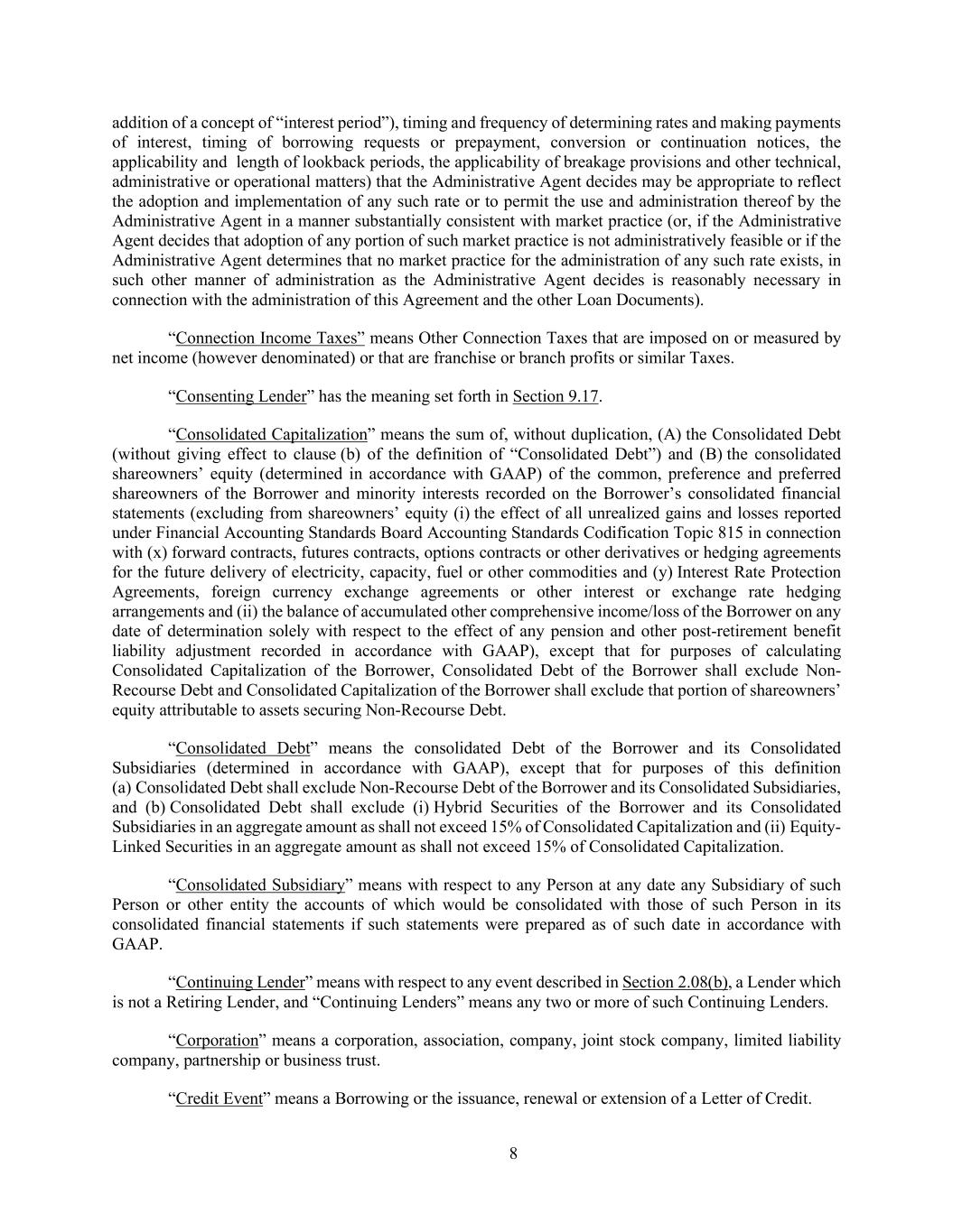 8 addition of a concept of “interest period”), timing and frequency of determining rates and making payments of interest, timing of borrowing requests or prepayment, conversion or continuation notices, the applicability and length of lookback periods, the applicability of breakage provisions and other technical, administrative or operational matters) that the Administrative Agent decides may be appropriate to reflect the adoption and implementation of any such rate or to permit the use and administration thereof by the Administrative Agent in a manner substantially consistent with market practice (or, if the Administrative Agent decides that adoption of any portion of such market practice is not administratively feasible or if the Administrative Agent determines that no market practice for the administration of any such rate exists, in such other manner of administration as the Administrative Agent decides is reasonably necessary in connection with the administration of this Agreement and the other Loan Documents). “Connection Income Taxes” means Other Connection Taxes that are imposed on or measured by net income (however denominated) or that are franchise or branch profits or similar Taxes. “Consenting Lender” has the meaning set forth in Section 9.17. “Consolidated Capitalization” means the sum of, without duplication, (A) the Consolidated Debt (without giving effect to clause (b) of the definition of “Consolidated Debt”) and (B) the consolidated shareowners’ equity (determined in accordance with GAAP) of the common, preference and preferred shareowners of the Borrower and minority interests recorded on the Borrower’s consolidated financial statements (excluding from shareowners’ equity (i) the effect of all unrealized gains and losses reported under Financial Accounting Standards Board Accounting Standards Codification Topic 815 in connection with (x) forward contracts, futures contracts, options contracts or other derivatives or hedging agreements for the future delivery of electricity, capacity, fuel or other commodities and (y) Interest Rate Protection Agreements, foreign currency exchange agreements or other interest or exchange rate hedging arrangements and (ii) the balance of accumulated other comprehensive income/loss of the Borrower on any date of determination solely with respect to the effect of any pension and other post-retirement benefit liability adjustment recorded in accordance with GAAP), except that for purposes of calculating Consolidated Capitalization of the Borrower, Consolidated Debt of the Borrower shall exclude Non- Recourse Debt and Consolidated Capitalization of the Borrower shall exclude that portion of shareowners’ equity attributable to assets securing Non-Recourse Debt. “Consolidated Debt” means the consolidated Debt of the Borrower and its Consolidated Subsidiaries (determined in accordance with GAAP), except that for purposes of this definition (a) Consolidated Debt shall exclude Non-Recourse Debt of the Borrower and its Consolidated Subsidiaries, and (b) Consolidated Debt shall exclude (i) Hybrid Securities of the Borrower and its Consolidated Subsidiaries in an aggregate amount as shall not exceed 15% of Consolidated Capitalization and (ii) Equity- Linked Securities in an aggregate amount as shall not exceed 15% of Consolidated Capitalization. “Consolidated Subsidiary” means with respect to any Person at any date any Subsidiary of such Person or other entity the accounts of which would be consolidated with those of such Person in its consolidated financial statements if such statements were prepared as of such date in accordance with GAAP. “Continuing Lender” means with respect to any event described in Section 2.08(b), a Lender which is not a Retiring Lender, and “Continuing Lenders” means any two or more of such Continuing Lenders. “Corporation” means a corporation, association, company, joint stock company, limited liability company, partnership or business trust. “Credit Event” means a Borrowing or the issuance, renewal or extension of a Letter of Credit.