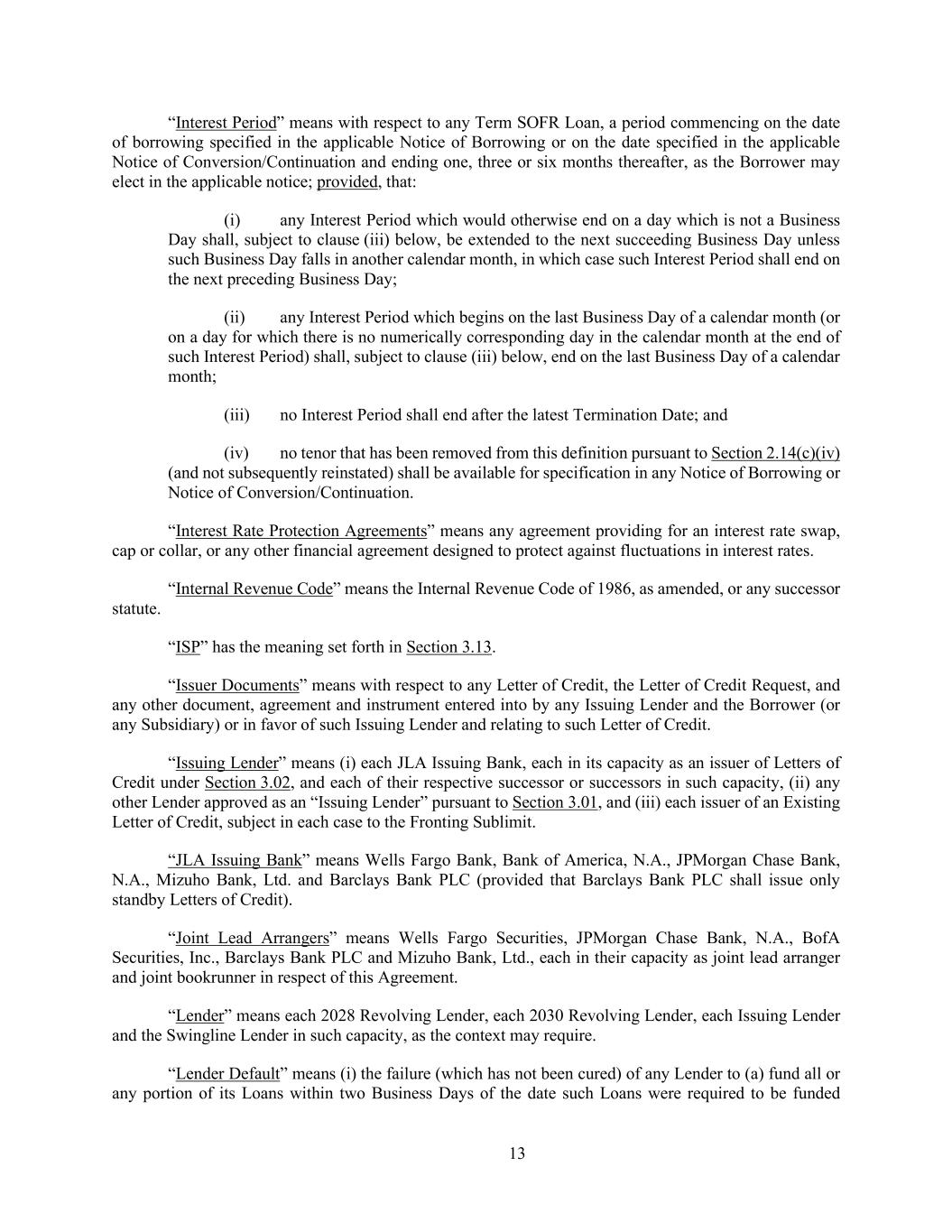 13 “Interest Period” means with respect to any Term SOFR Loan, a period commencing on the date of borrowing specified in the applicable Notice of Borrowing or on the date specified in the applicable Notice of Conversion/Continuation and ending one, three or six months thereafter, as the Borrower may elect in the applicable notice; provided, that: (i) any Interest Period which would otherwise end on a day which is not a Business Day shall, subject to clause (iii) below, be extended to the next succeeding Business Day unless such Business Day falls in another calendar month, in which case such Interest Period shall end on the next preceding Business Day; (ii) any Interest Period which begins on the last Business Day of a calendar month (or on a day for which there is no numerically corresponding day in the calendar month at the end of such Interest Period) shall, subject to clause (iii) below, end on the last Business Day of a calendar month; (iii) no Interest Period shall end after the latest Termination Date; and (iv) no tenor that has been removed from this definition pursuant to Section 2.14(c)(iv) (and not subsequently reinstated) shall be available for specification in any Notice of Borrowing or Notice of Conversion/Continuation. “Interest Rate Protection Agreements” means any agreement providing for an interest rate swap, cap or collar, or any other financial agreement designed to protect against fluctuations in interest rates. “Internal Revenue Code” means the Internal Revenue Code of 1986, as amended, or any successor statute. “ISP” has the meaning set forth in Section 3.13. “Issuer Documents” means with respect to any Letter of Credit, the Letter of Credit Request, and any other document, agreement and instrument entered into by any Issuing Lender and the Borrower (or any Subsidiary) or in favor of such Issuing Lender and relating to such Letter of Credit. “Issuing Lender” means (i) each JLA Issuing Bank, each in its capacity as an issuer of Letters of Credit under Section 3.02, and each of their respective successor or successors in such capacity, (ii) any other Lender approved as an “Issuing Lender” pursuant to Section 3.01, and (iii) each issuer of an Existing Letter of Credit, subject in each case to the Fronting Sublimit. “JLA Issuing Bank” means Wells Fargo Bank, Bank of America, N.A., JPMorgan Chase Bank, N.A., Mizuho Bank, Ltd. and Barclays Bank PLC (provided that Barclays Bank PLC shall issue only standby Letters of Credit). “Joint Lead Arrangers” means Wells Fargo Securities, JPMorgan Chase Bank, N.A., BofA Securities, Inc., Barclays Bank PLC and Mizuho Bank, Ltd., each in their capacity as joint lead arranger and joint bookrunner in respect of this Agreement. “Lender” means each 2028 Revolving Lender, each 2030 Revolving Lender, each Issuing Lender and the Swingline Lender in such capacity, as the context may require. “Lender Default” means (i) the failure (which has not been cured) of any Lender to (a) fund all or any portion of its Loans within two Business Days of the date such Loans were required to be funded