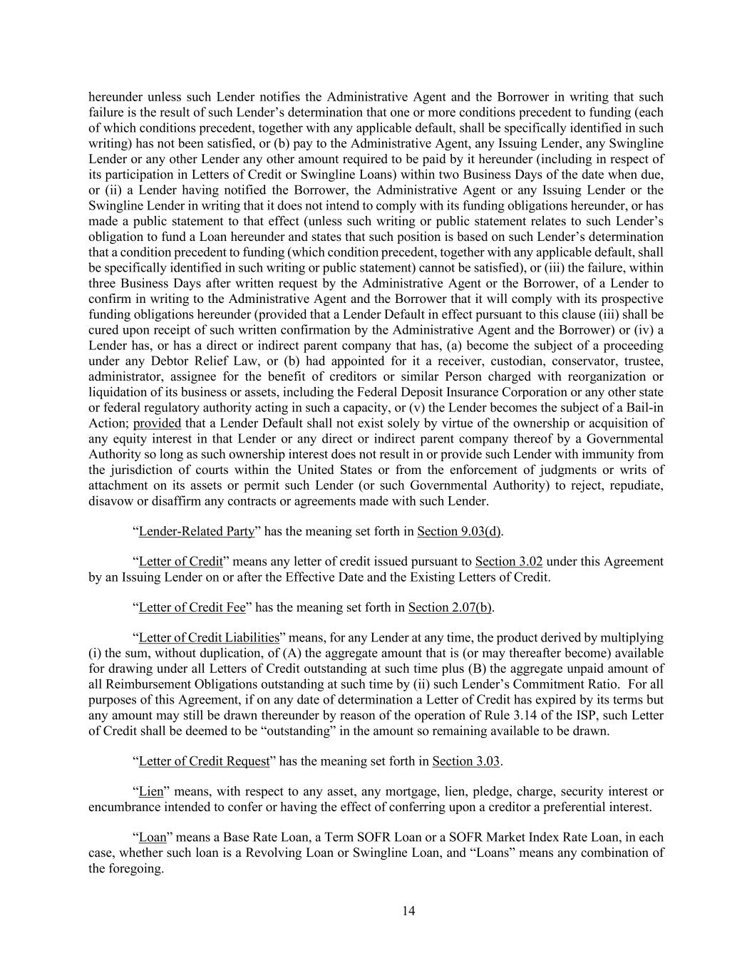 14 hereunder unless such Lender notifies the Administrative Agent and the Borrower in writing that such failure is the result of such Lender’s determination that one or more conditions precedent to funding (each of which conditions precedent, together with any applicable default, shall be specifically identified in such writing) has not been satisfied, or (b) pay to the Administrative Agent, any Issuing Lender, any Swingline Lender or any other Lender any other amount required to be paid by it hereunder (including in respect of its participation in Letters of Credit or Swingline Loans) within two Business Days of the date when due, or (ii) a Lender having notified the Borrower, the Administrative Agent or any Issuing Lender or the Swingline Lender in writing that it does not intend to comply with its funding obligations hereunder, or has made a public statement to that effect (unless such writing or public statement relates to such Lender’s obligation to fund a Loan hereunder and states that such position is based on such Lender’s determination that a condition precedent to funding (which condition precedent, together with any applicable default, shall be specifically identified in such writing or public statement) cannot be satisfied), or (iii) the failure, within three Business Days after written request by the Administrative Agent or the Borrower, of a Lender to confirm in writing to the Administrative Agent and the Borrower that it will comply with its prospective funding obligations hereunder (provided that a Lender Default in effect pursuant to this clause (iii) shall be cured upon receipt of such written confirmation by the Administrative Agent and the Borrower) or (iv) a Lender has, or has a direct or indirect parent company that has, (a) become the subject of a proceeding under any Debtor Relief Law, or (b) had appointed for it a receiver, custodian, conservator, trustee, administrator, assignee for the benefit of creditors or similar Person charged with reorganization or liquidation of its business or assets, including the Federal Deposit Insurance Corporation or any other state or federal regulatory authority acting in such a capacity, or (v) the Lender becomes the subject of a Bail-in Action; provided that a Lender Default shall not exist solely by virtue of the ownership or acquisition of any equity interest in that Lender or any direct or indirect parent company thereof by a Governmental Authority so long as such ownership interest does not result in or provide such Lender with immunity from the jurisdiction of courts within the United States or from the enforcement of judgments or writs of attachment on its assets or permit such Lender (or such Governmental Authority) to reject, repudiate, disavow or disaffirm any contracts or agreements made with such Lender. “Lender-Related Party” has the meaning set forth in Section 9.03(d). “Letter of Credit” means any letter of credit issued pursuant to Section 3.02 under this Agreement by an Issuing Lender on or after the Effective Date and the Existing Letters of Credit. “Letter of Credit Fee” has the meaning set forth in Section 2.07(b). “Letter of Credit Liabilities” means, for any Lender at any time, the product derived by multiplying (i) the sum, without duplication, of (A) the aggregate amount that is (or may thereafter become) available for drawing under all Letters of Credit outstanding at such time plus (B) the aggregate unpaid amount of all Reimbursement Obligations outstanding at such time by (ii) such Lender’s Commitment Ratio. For all purposes of this Agreement, if on any date of determination a Letter of Credit has expired by its terms but any amount may still be drawn thereunder by reason of the operation of Rule 3.14 of the ISP, such Letter of Credit shall be deemed to be “outstanding” in the amount so remaining available to be drawn. “Letter of Credit Request” has the meaning set forth in Section 3.03. “Lien” means, with respect to any asset, any mortgage, lien, pledge, charge, security interest or encumbrance intended to confer or having the effect of conferring upon a creditor a preferential interest. “Loan” means a Base Rate Loan, a Term SOFR Loan or a SOFR Market Index Rate Loan, in each case, whether such loan is a Revolving Loan or Swingline Loan, and “Loans” means any combination of the foregoing.