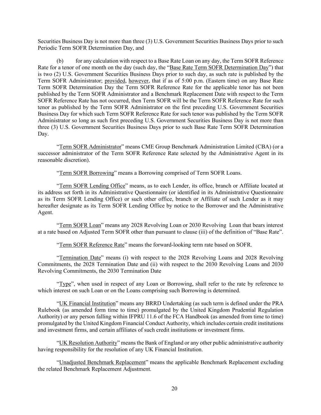 20 Securities Business Day is not more than three (3) U.S. Government Securities Business Days prior to such Periodic Term SOFR Determination Day, and (b) for any calculation with respect to a Base Rate Loan on any day, the Term SOFR Reference Rate for a tenor of one month on the day (such day, the “Base Rate Term SOFR Determination Day”) that is two (2) U.S. Government Securities Business Days prior to such day, as such rate is published by the Term SOFR Administrator; provided, however, that if as of 5:00 p.m. (Eastern time) on any Base Rate Term SOFR Determination Day the Term SOFR Reference Rate for the applicable tenor has not been published by the Term SOFR Administrator and a Benchmark Replacement Date with respect to the Term SOFR Reference Rate has not occurred, then Term SOFR will be the Term SOFR Reference Rate for such tenor as published by the Term SOFR Administrator on the first preceding U.S. Government Securities Business Day for which such Term SOFR Reference Rate for such tenor was published by the Term SOFR Administrator so long as such first preceding U.S. Government Securities Business Day is not more than three (3) U.S. Government Securities Business Days prior to such Base Rate Term SOFR Determination Day. “Term SOFR Administrator” means CME Group Benchmark Administration Limited (CBA) (or a successor administrator of the Term SOFR Reference Rate selected by the Administrative Agent in its reasonable discretion). “Term SOFR Borrowing” means a Borrowing comprised of Term SOFR Loans. “Term SOFR Lending Office” means, as to each Lender, its office, branch or Affiliate located at its address set forth in its Administrative Questionnaire (or identified in its Administrative Questionnaire as its Term SOFR Lending Office) or such other office, branch or Affiliate of such Lender as it may hereafter designate as its Term SOFR Lending Office by notice to the Borrower and the Administrative Agent. “Term SOFR Loan” means any 2028 Revolving Loan or 2030 Revolving Loan that bears interest at a rate based on Adjusted Term SOFR other than pursuant to clause (iii) of the definition of “Base Rate”. “Term SOFR Reference Rate” means the forward-looking term rate based on SOFR. “Termination Date” means (i) with respect to the 2028 Revolving Loans and 2028 Revolving Commitments, the 2028 Termination Date and (ii) with respect to the 2030 Revolving Loans and 2030 Revolving Commitments, the 2030 Termination Date “Type”, when used in respect of any Loan or Borrowing, shall refer to the rate by reference to which interest on such Loan or on the Loans comprising such Borrowing is determined. “UK Financial Institution” means any BRRD Undertaking (as such term is defined under the PRA Rulebook (as amended form time to time) promulgated by the United Kingdom Prudential Regulation Authority) or any person falling within IFPRU 11.6 of the FCA Handbook (as amended from time to time) promulgated by the United Kingdom Financial Conduct Authority, which includes certain credit institutions and investment firms, and certain affiliates of such credit institutions or investment firms. “UK Resolution Authority” means the Bank of England or any other public administrative authority having responsibility for the resolution of any UK Financial Institution. “Unadjusted Benchmark Replacement” means the applicable Benchmark Replacement excluding the related Benchmark Replacement Adjustment.