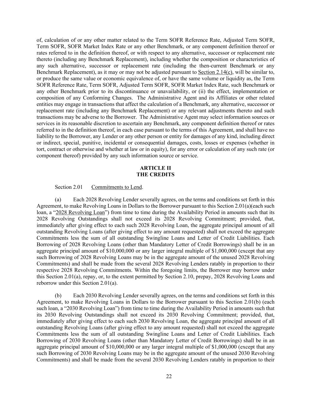 22 of, calculation of or any other matter related to the Term SOFR Reference Rate, Adjusted Term SOFR, Term SOFR, SOFR Market Index Rate or any other Benchmark, or any component definition thereof or rates referred to in the definition thereof, or with respect to any alternative, successor or replacement rate thereto (including any Benchmark Replacement), including whether the composition or characteristics of any such alternative, successor or replacement rate (including the then-current Benchmark or any Benchmark Replacement), as it may or may not be adjusted pursuant to Section 2.14(c), will be similar to, or produce the same value or economic equivalence of, or have the same volume or liquidity as, the Term SOFR Reference Rate, Term SOFR, Adjusted Term SOFR, SOFR Market Index Rate, such Benchmark or any other Benchmark prior to its discontinuance or unavailability, or (ii) the effect, implementation or composition of any Conforming Changes. The Administrative Agent and its Affiliates or other related entities may engage in transactions that affect the calculation of a Benchmark, any alternative, successor or replacement rate (including any Benchmark Replacement) or any relevant adjustments thereto and such transactions may be adverse to the Borrower. The Administrative Agent may select information sources or services in its reasonable discretion to ascertain any Benchmark, any component definition thereof or rates referred to in the definition thereof, in each case pursuant to the terms of this Agreement, and shall have no liability to the Borrower, any Lender or any other person or entity for damages of any kind, including direct or indirect, special, punitive, incidental or consequential damages, costs, losses or expenses (whether in tort, contract or otherwise and whether at law or in equity), for any error or calculation of any such rate (or component thereof) provided by any such information source or service. ARTICLE II THE CREDITS Section 2.01 Commitments to Lend. (a) Each 2028 Revolving Lender severally agrees, on the terms and conditions set forth in this Agreement, to make Revolving Loans in Dollars to the Borrower pursuant to this Section 2.01(a)(each such loan, a “2028 Revolving Loan”) from time to time during the Availability Period in amounts such that its 2028 Revolving Outstandings shall not exceed its 2028 Revolving Commitment; provided, that, immediately after giving effect to each such 2028 Revolving Loan, the aggregate principal amount of all outstanding Revolving Loans (after giving effect to any amount requested) shall not exceed the aggregate Commitments less the sum of all outstanding Swingline Loans and Letter of Credit Liabilities. Each Borrowing of 2028 Revolving Loans (other than Mandatory Letter of Credit Borrowings) shall be in an aggregate principal amount of $10,000,000 or any larger integral multiple of $1,000,000 (except that any such Borrowing of 2028 Revolving Loans may be in the aggregate amount of the unused 2028 Revolving Commitments) and shall be made from the several 2028 Revolving Lenders ratably in proportion to their respective 2028 Revolving Commitments. Within the foregoing limits, the Borrower may borrow under this Section 2.01(a), repay, or, to the extent permitted by Section 2.10, prepay, 2028 Revolving Loans and reborrow under this Section 2.01(a). (b) Each 2030 Revolving Lender severally agrees, on the terms and conditions set forth in this Agreement, to make Revolving Loans in Dollars to the Borrower pursuant to this Section 2.01(b) (each such loan, a “2030 Revolving Loan”) from time to time during the Availability Period in amounts such that its 2030 Revolving Outstandings shall not exceed its 2030 Revolving Commitment; provided, that, immediately after giving effect to each such 2030 Revolving Loan, the aggregate principal amount of all outstanding Revolving Loans (after giving effect to any amount requested) shall not exceed the aggregate Commitments less the sum of all outstanding Swingline Loans and Letter of Credit Liabilities. Each Borrowing of 2030 Revolving Loans (other than Mandatory Letter of Credit Borrowings) shall be in an aggregate principal amount of $10,000,000 or any larger integral multiple of $1,000,000 (except that any such Borrowing of 2030 Revolving Loans may be in the aggregate amount of the unused 2030 Revolving Commitments) and shall be made from the several 2030 Revolving Lenders ratably in proportion to their